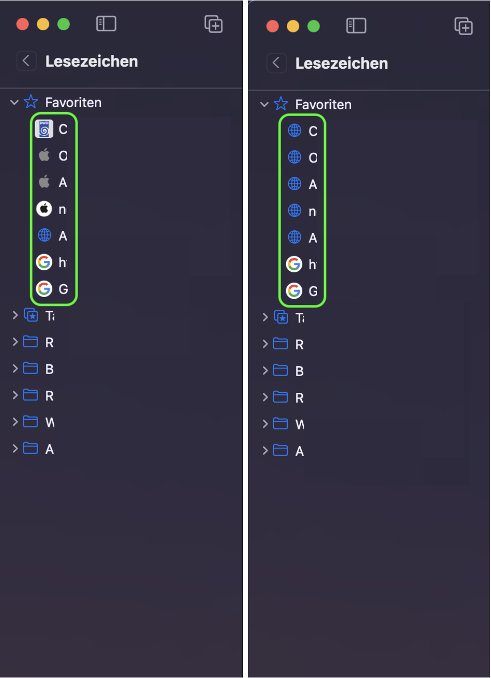 Das Bild links zeigt die Seitenleiste vor dem Schließen und Beenden von Safari, die Seitenleiste rechts im Bild siehst du, wenn du Safari nach dem Leeren des Cache-Speichers wieder öffnest.