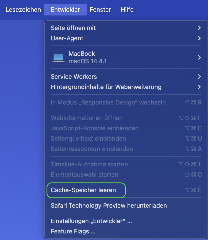 Safari-Cache mithilfe eines Tastaturbefehls löschen: