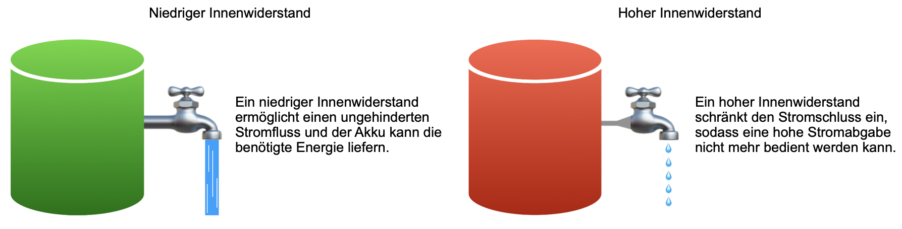 Im Gegensatz zu anderen Akkus kann der hohe Innenwiderstand eines Lithium-Ionen-Akkus nicht durch Ausgleichsladungen reguliert werden. Die Ursache liegt in der Oxidation innerhalb der Zelle und die ist nicht reversibel. Nicht nur deshalb ist ein niedriger Innenwiderstand wünschens- und erstrebenswert. Ein geringerer Spannungsabfall, weniger Wärmeentwicklung und eine höhere Effizienz beim Laden sind weitere positive Punkte.