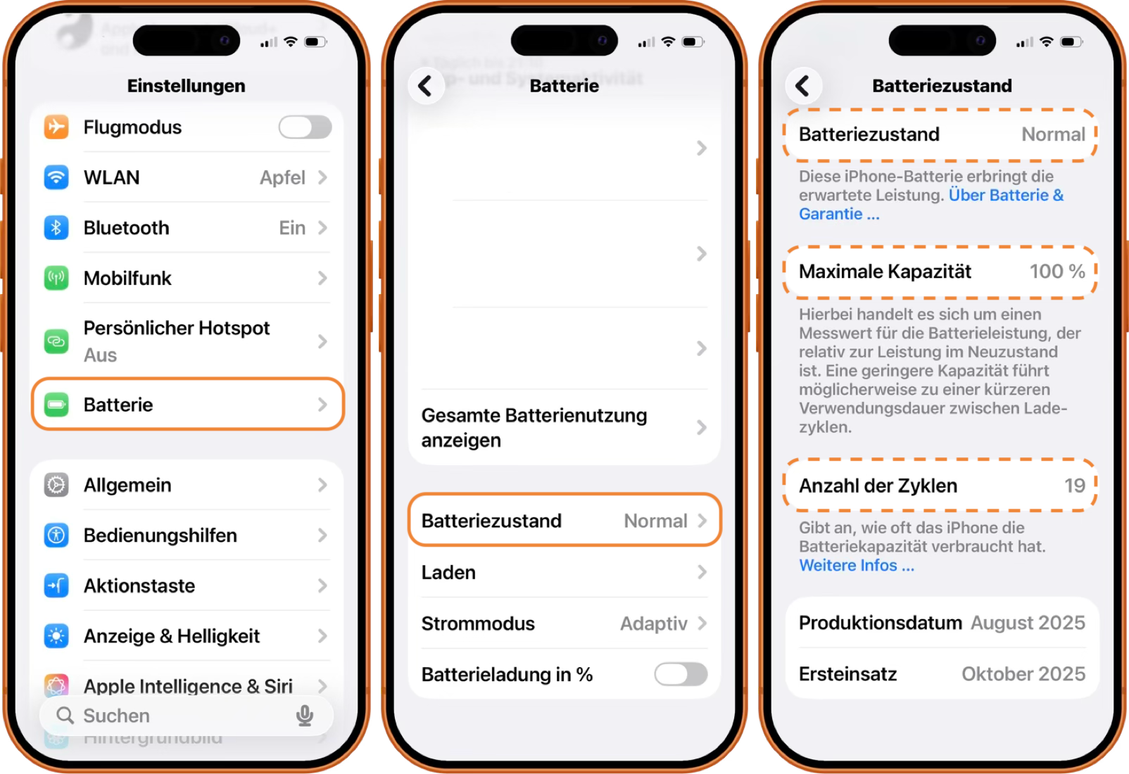 Die Kapazität eines Akkus verändert sich im Vergleich zu einer neuen Batterie, sodass dieser öfter aufgeladen werden muss. Das liegt daran, dass der Akku chemisch altert und so die Fähigkeit verliert, die Ladung zu halten. Der in deinem iPhone angezeigte Wert stellt einen Vergleich zu einem neuen Akku dar. Du findest diesen unter