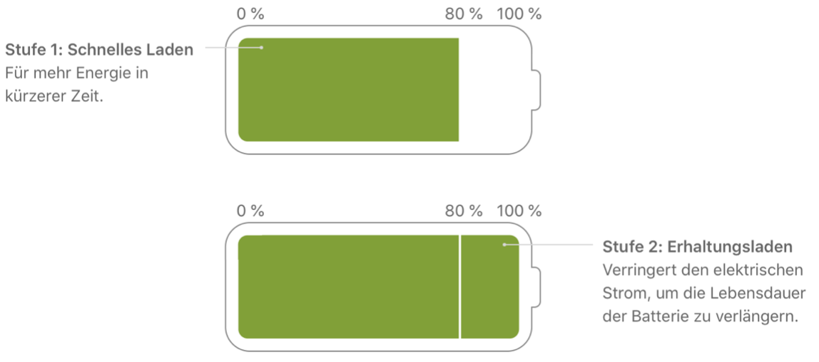 Hierbei wird der Akku in kurzer Zeit auf 80 % seiner Kapazität aufgeladen, so kannst du dein iPhone schneller wieder nutzen. Die restliche Ladung auf 100 % erfolgt zu einem späteren Zeitpunkt, um die Zeit der vollen Aufladung möglichst kurz zu halten. Apple fasst hier den Vorgang zwischen dem Stop der Ladung und der Aufladung auf 100 % als Erhaltungsladung zusammen.