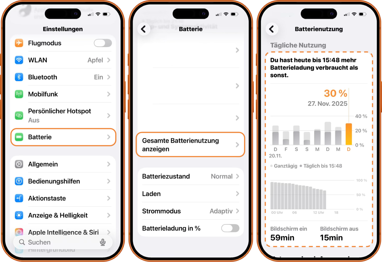 Hierbei handelt es sich um die Zeitspanne, in der du dein iPhone nutzen kannst, bevor du es wieder aufladen musst. Wie lang diese Zeitpanne ist, hängt davon ab, wie intensiv und wie lange du dein Gerät nutzt.