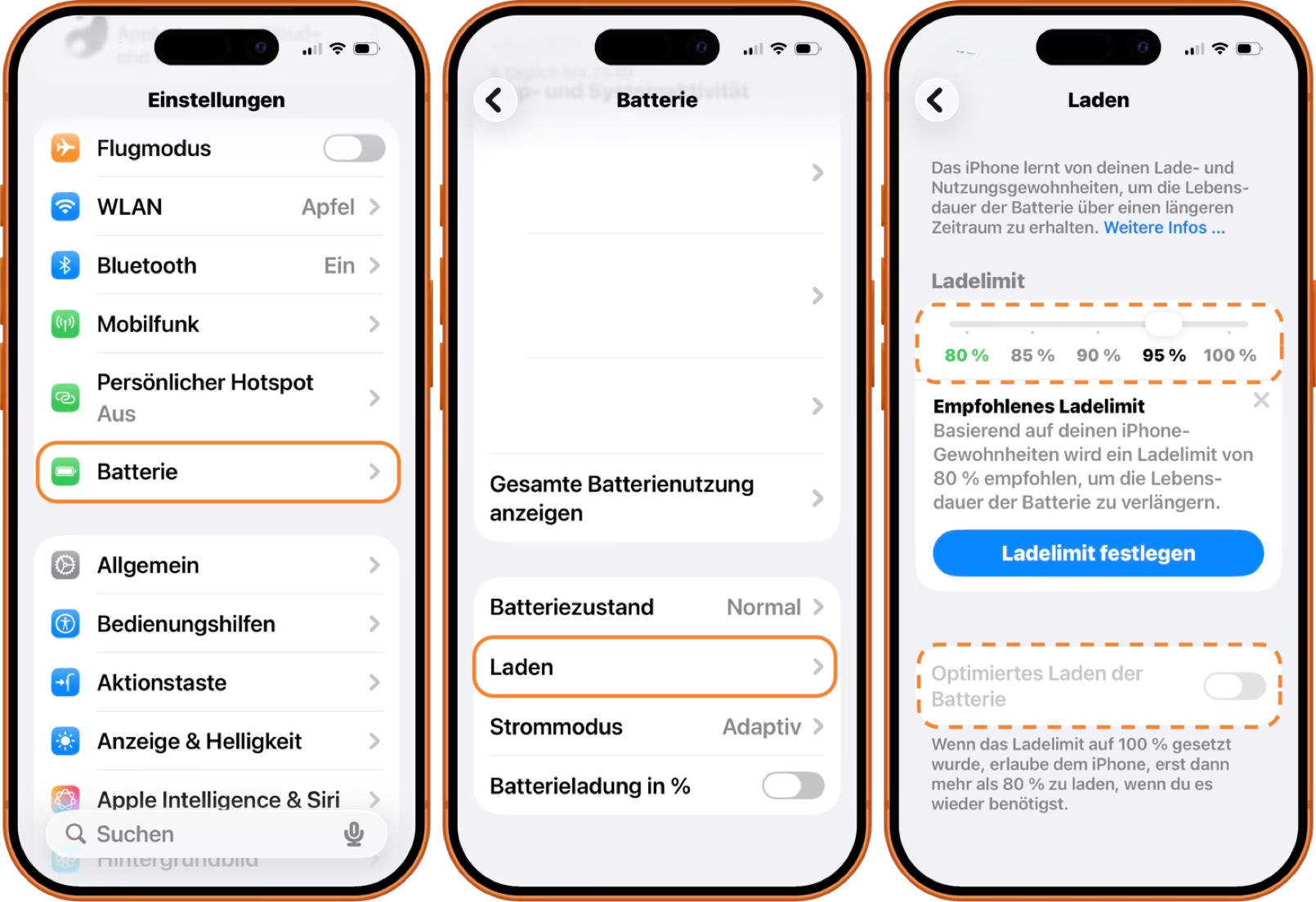 Hast du ein Ladelimit oder optimiertes Laden gewählt, wird der Akku deines Gerätes hin und wieder auf 100 % geladen. Diese Maßnahme ist kein Fehler, sondern dient dazu, dir später ein genaueres Ergebnis zu liefern.