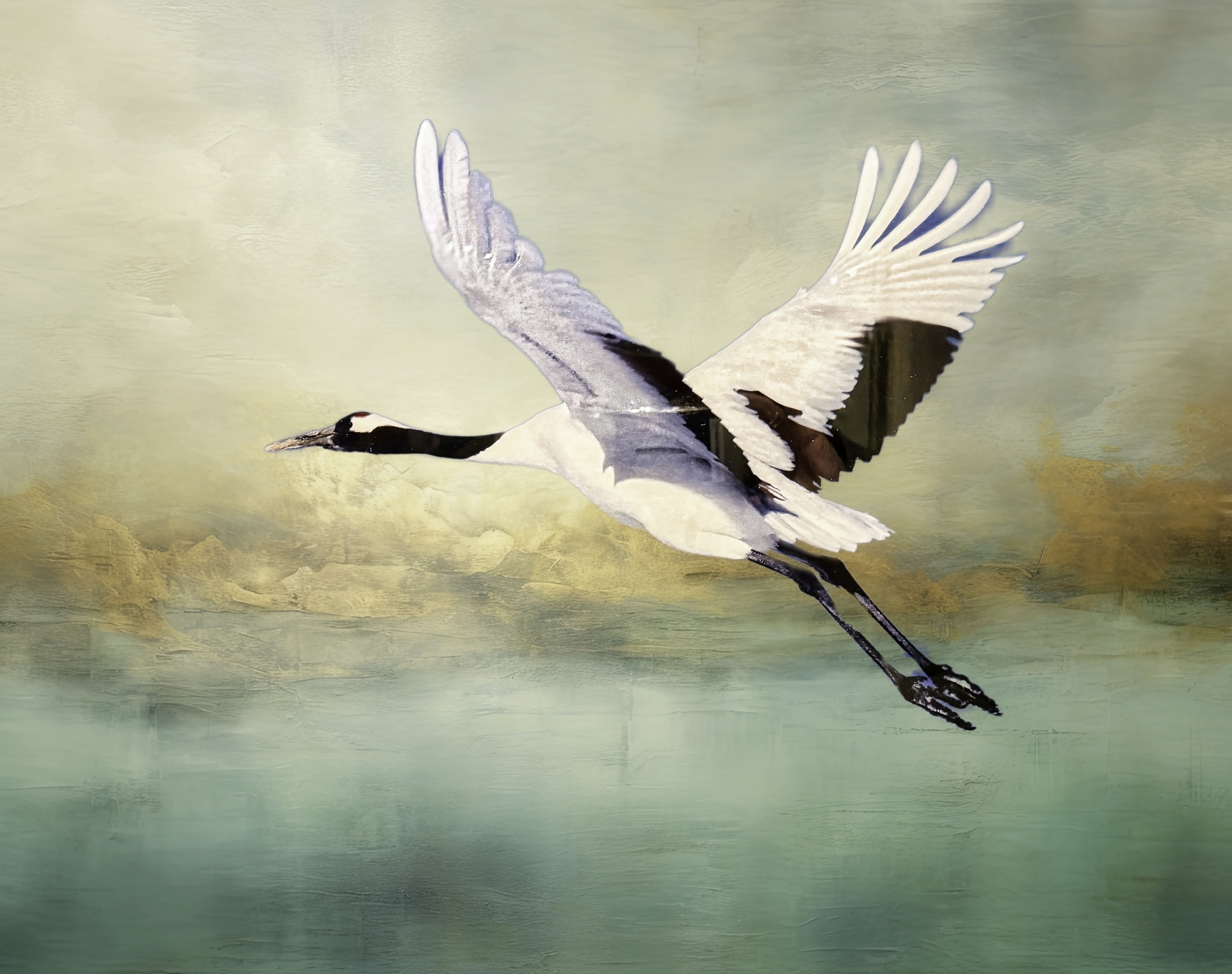 Auf dieselbe Weise habe ich bei diesem Bild eines Mandschurenkranichs im Flug den Hintergrund ausgewechselt, der mir nicht gefallen hatte: Der Hintergrund ist das Foto eines alten Ölbilds mit Himmel und Meer und der Kranich flog vor einem sehr unruhigen Hintergrund mit vielen Bäumen. Zwischen den Schwungfedern sieht man noch etwas vom vorherigen, dunkleren Hintergrund als aliasing.