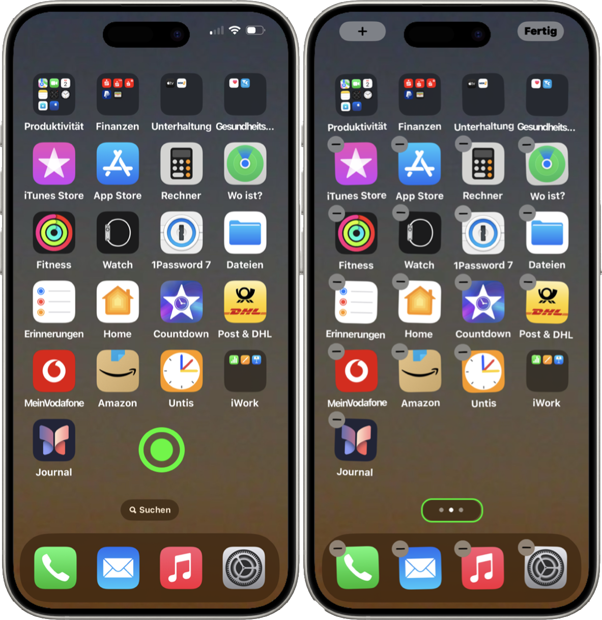 Auf meinem iPhone werden drei Punkte angezeigt (zwei für die Home-Bildschirme, einer für die App-Mediathek). Tippst du auf dieses Symbol, werden dir deine Home-Bildschirme in verkleinerter Darstellung angezeigt. Unter der jeweiligen Darstellung kannst du sehen, ob der dazugehörige Haken gesetzt wurde.