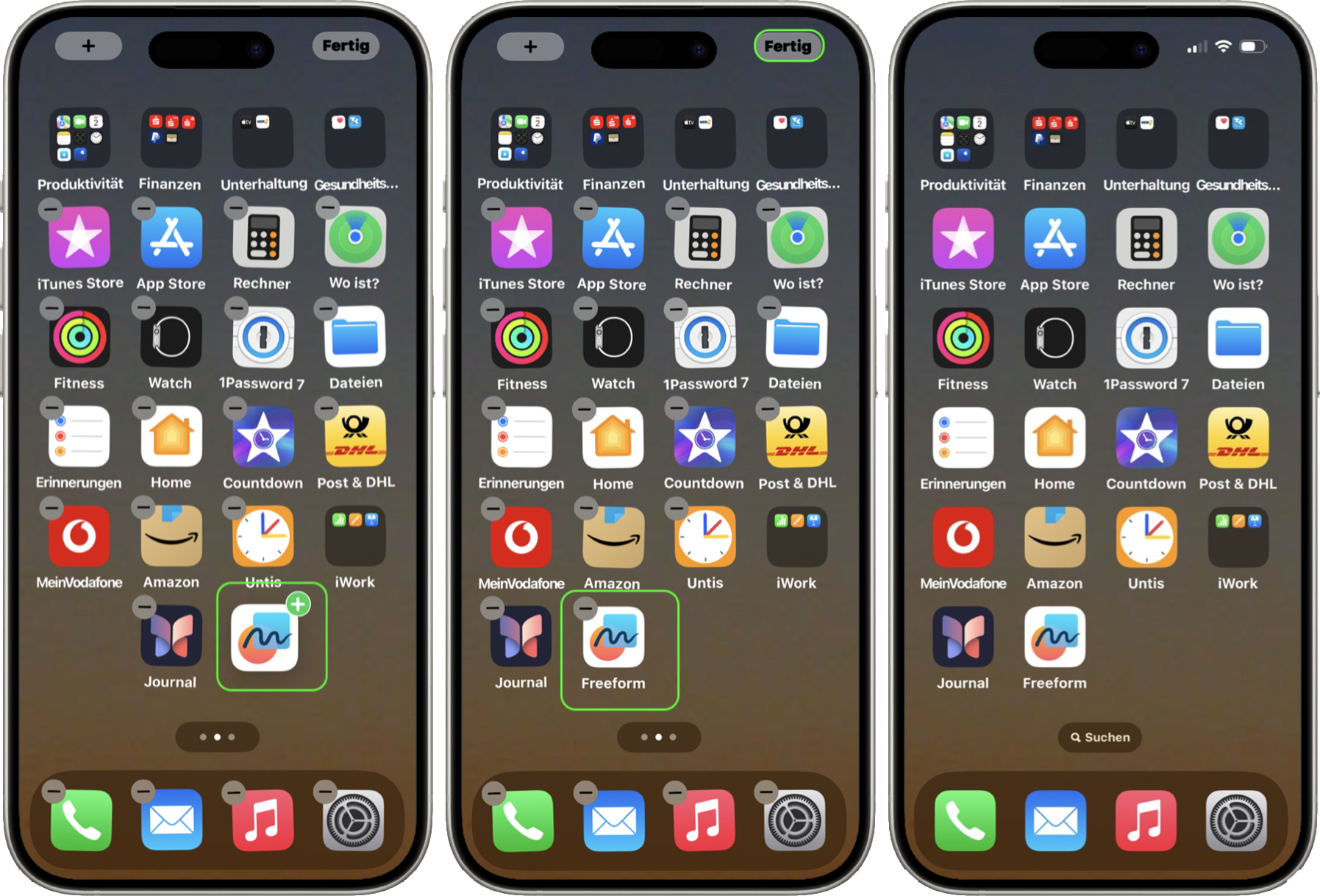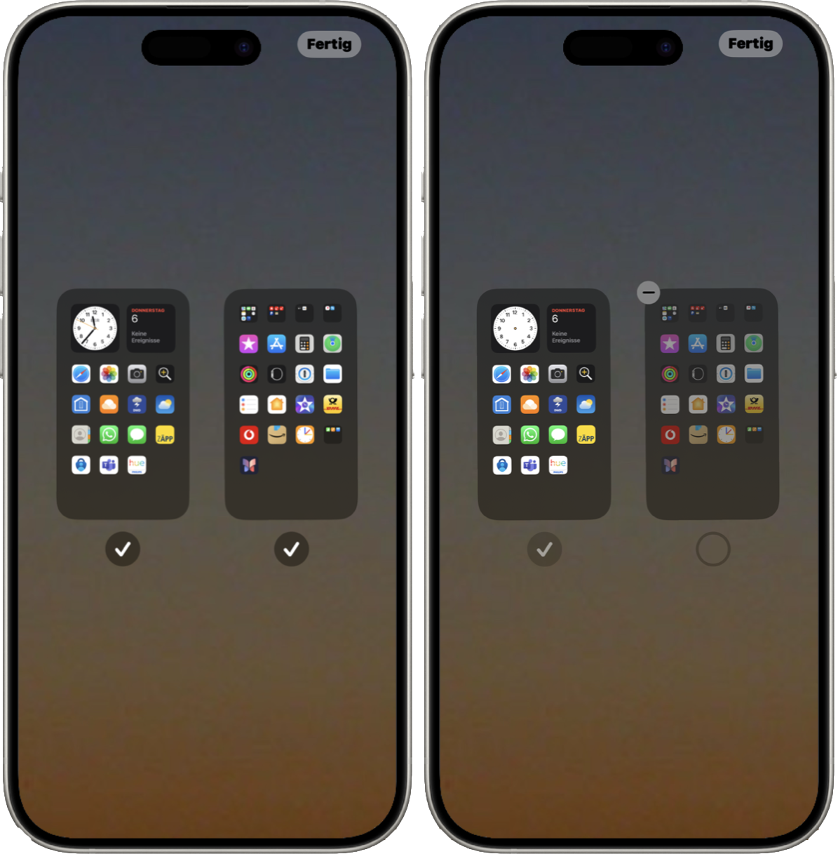 Möchtest du einen Home-Bildschirm ausblenden, tippe auf „Fertig“. Soll dieser gelöscht werden, tippe auf das (-) links neben der Darstellung und dann auf „Fertig“.