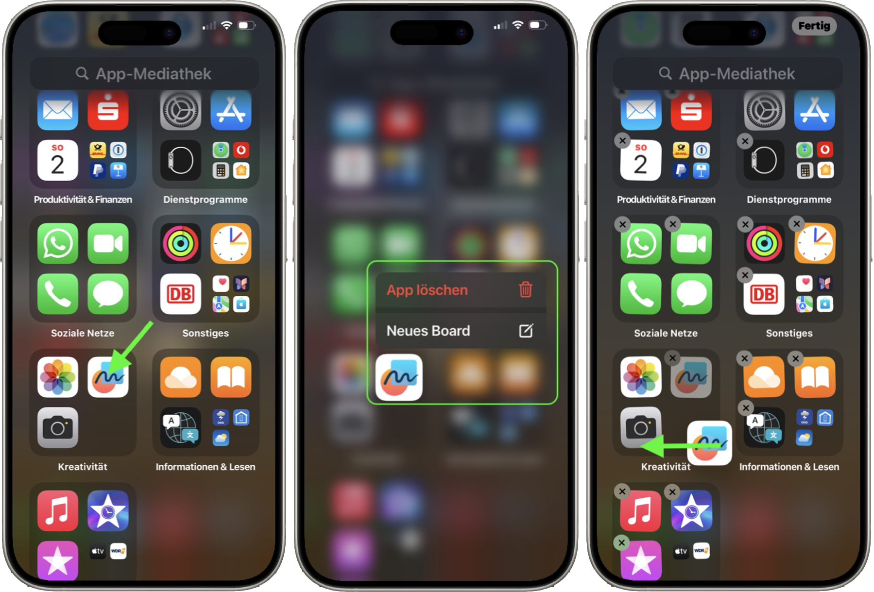 Tippe so lange auf das Icon der App (hier Freeform), bis du das Fenster im zweiten Bild siehst.