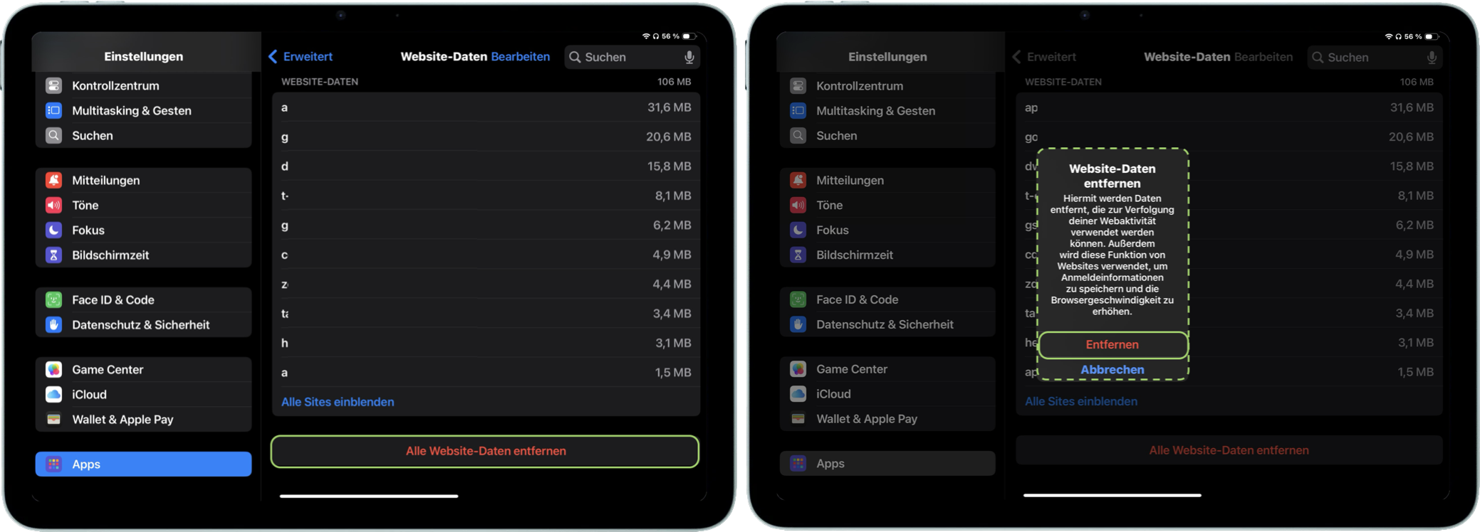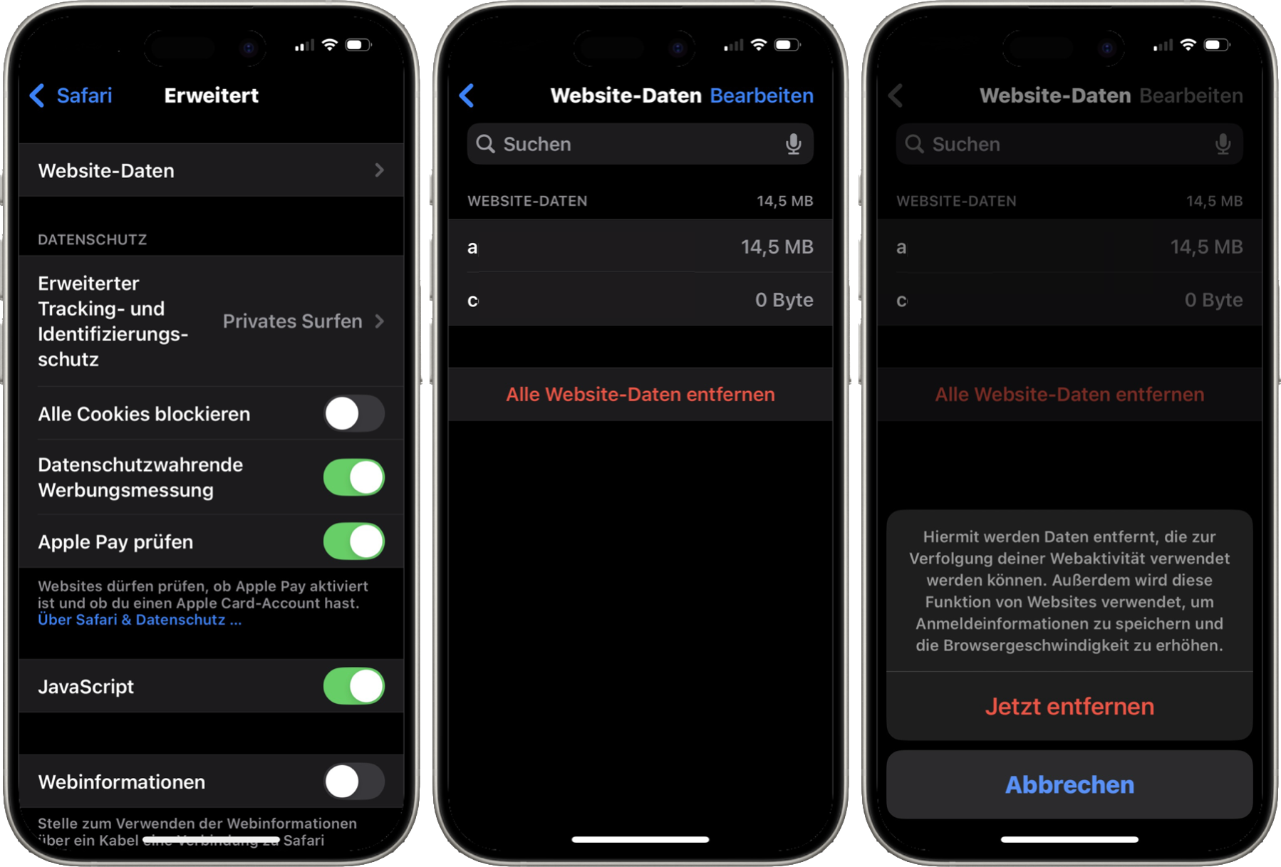 Tippe wieder auf „Alle Website-Daten entfernen“ und anschließend auf „Entfernen“.