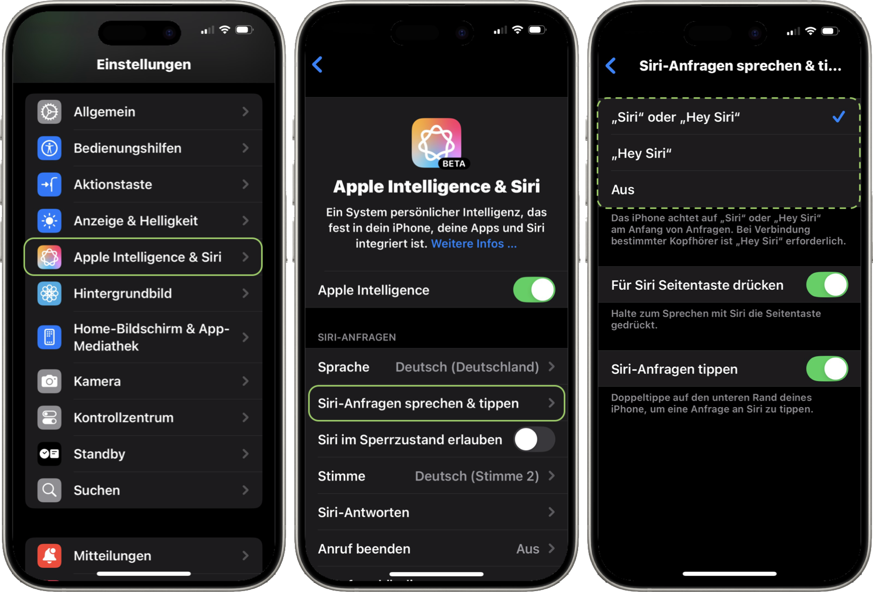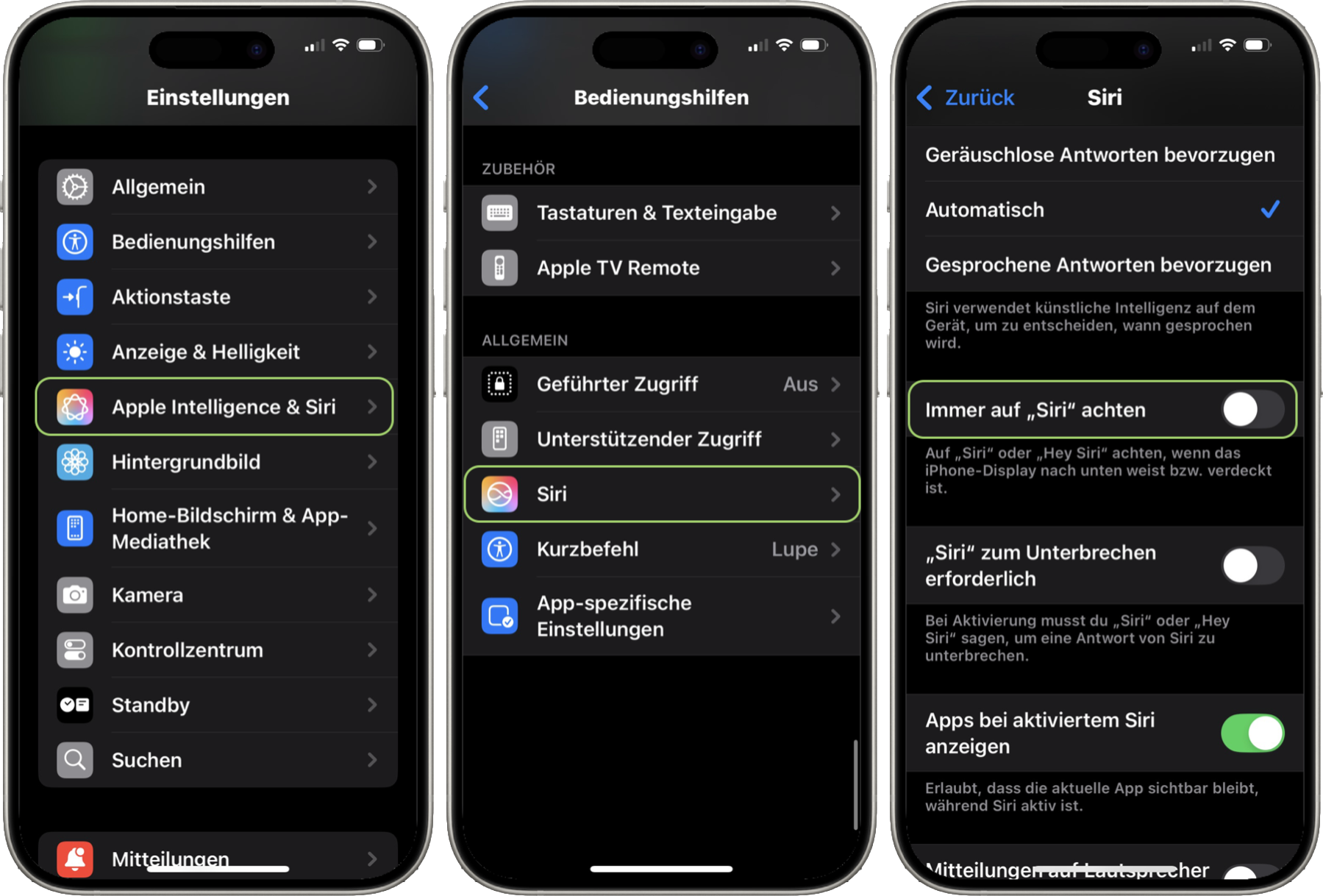 auf die entsprechenden Einstellungen zugreifen. Die standardmäßig deaktivierte Einstellung findest du ziemlich weit unten im Folgebildschirm. Aktivierst du den Button rechts neben „Immer auf „Siri" achten“, reagiert Siri auch dann, wenn das iPhone mit dem Display nach unten abgelegt wurde.