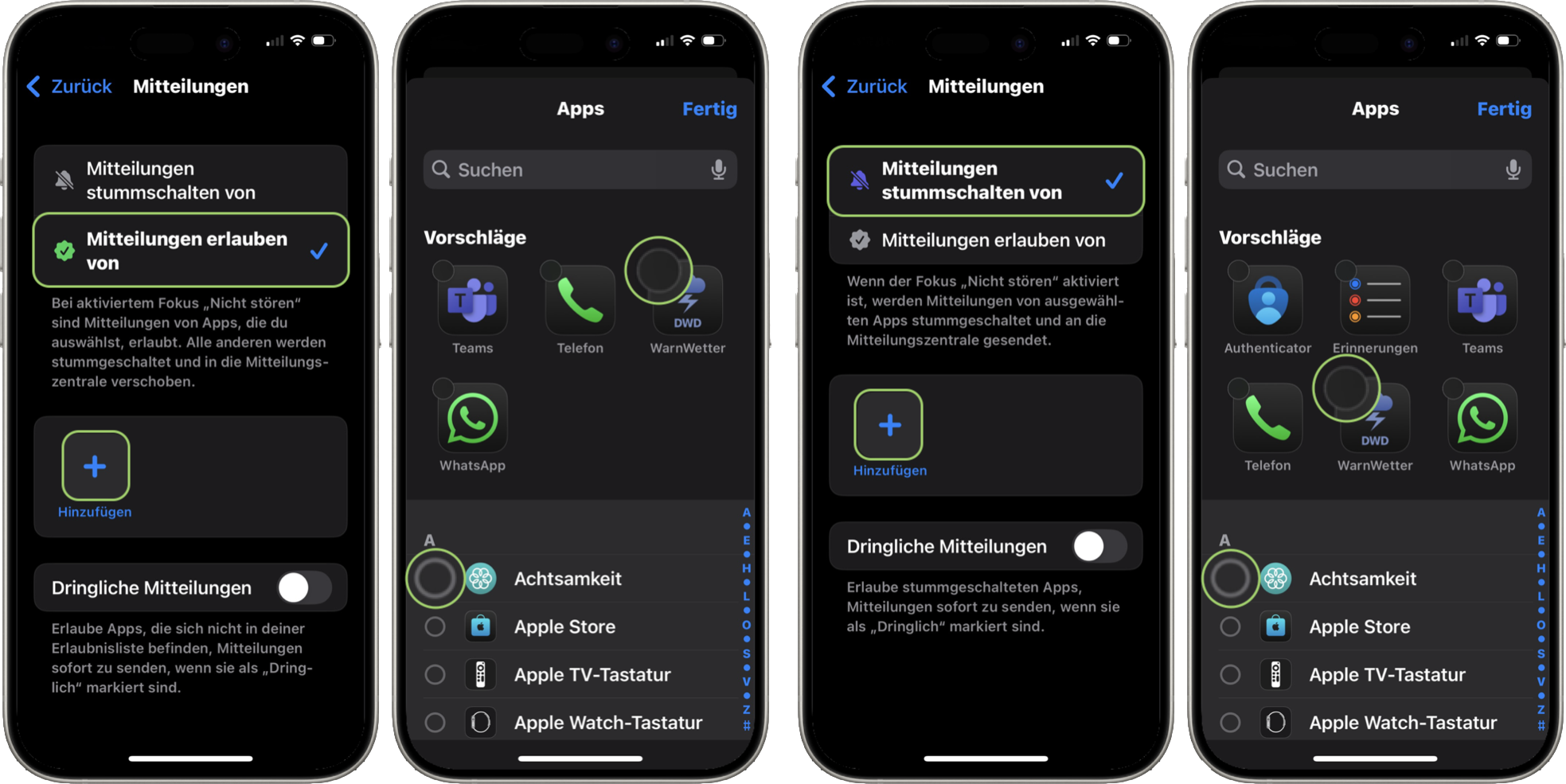 kannst du nicht nur Mitteilungen oder Anrufe erlauben oder stummschalten, auch Mitteilungen von Apps lassen sich entsprechend handhaben. Um diese zu erlauben, wähle „Mitteilungen erlauben von“ und wähle im Folgebildschirm die Apps aus, von denen du diese erhalten möchtest.