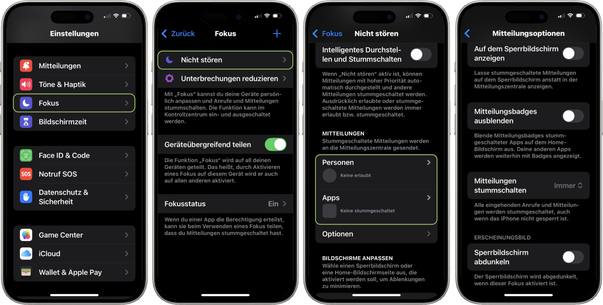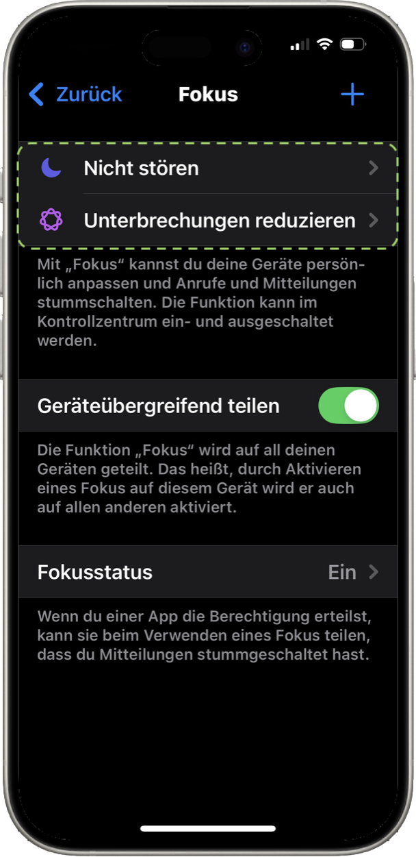 Fokus, Mitteilungen und Anrufe von Kontakten und Apps verwalten
