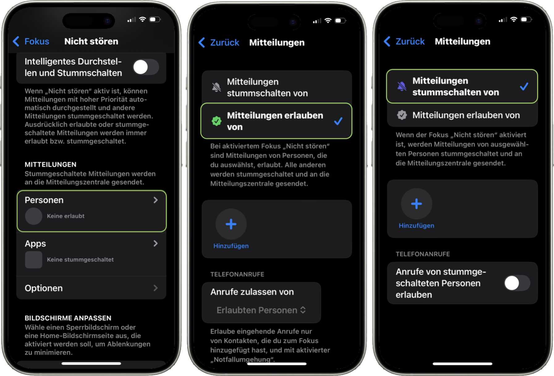 Möchtest du Mitteilungen einzelner Kontakte erlauben, wähle „Mitteilungen erlauben von“ aus und füge über das blaue + die entsprechenden Kontakte hinzu. Wähle dann aus, ob diese Kontakte dich auch anrufen dürfen.