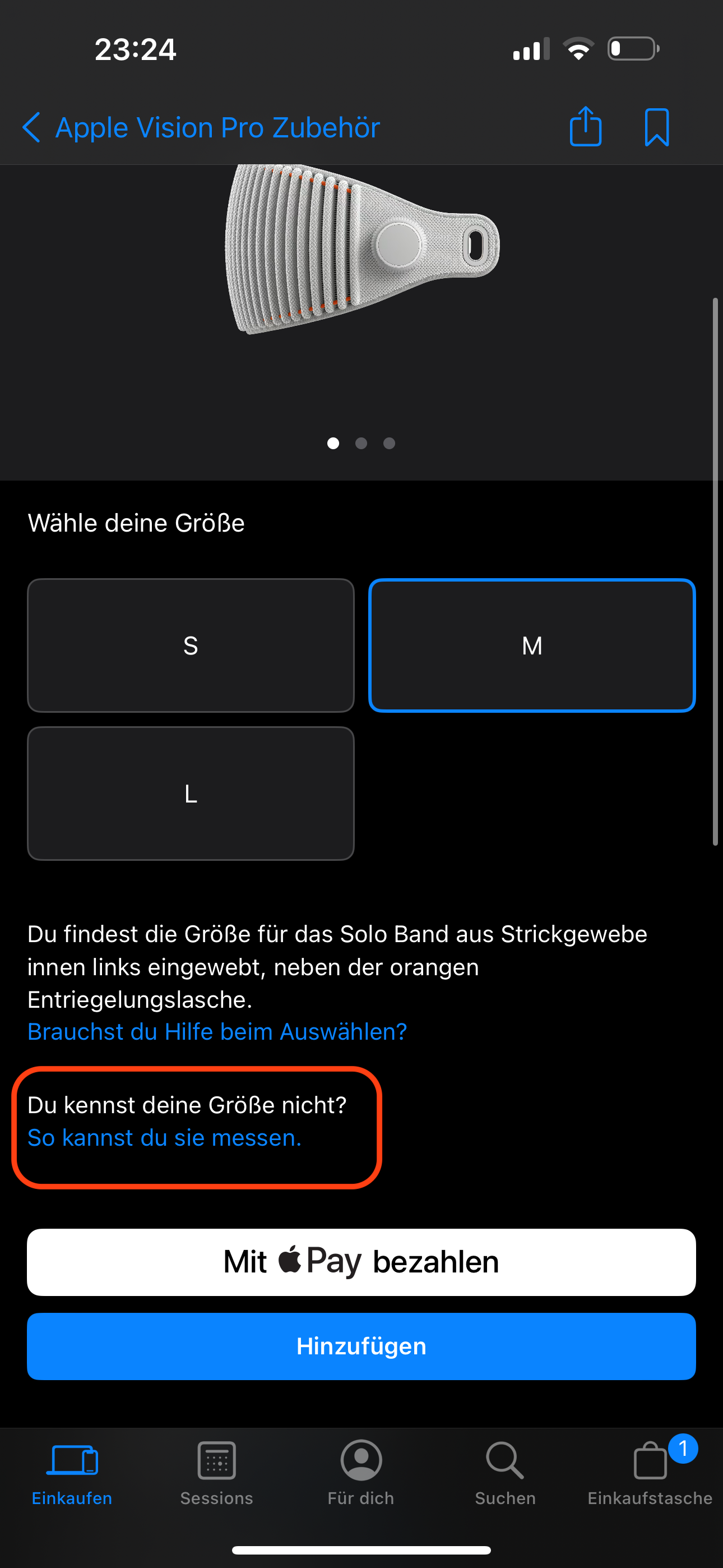 Und zu guter letzt haben wir auch noch die Kopfbänder, diese gibt es in S M und L und sind auch personalisiert auf den Kopf angepasst. Auch diese müssen ausgemessen werden, dafür verwenden wir wieder die Apple Store App. Hier öffnen wir entweder den Link zum Solo Band: Apple Vision Pro Solo Band aus Strickgewebe - M - Apple (DE) oder zum Dual Loop: Apple Vision Pro Dual Loop Band - Apple (DE). Im Anschluss klicken wir auf diese kleine Schaltfläche die im Screenshot markiert ist und lassen so den Kopf ausmessen. Dann wird uns auch hier wieder eine Größe angezeigt, bei mir ist das bei beiden M. Und auch hier kann man dann angepasst daran sich eventuellen Ersatz bestellen.