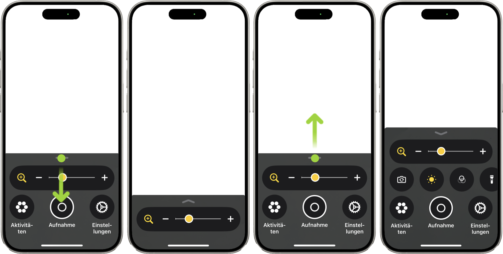 Wische auf der Markierung nach unten, um die Bedienung zu vereinfachen. Wische nach oben, um neben dem Zoom die Helligkeit anzupassen oder weitere Steuerelemente zu nutzen. Du kannst auch ein Standbild erstellen.
