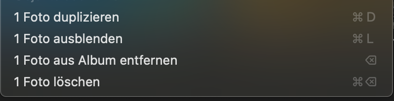 Normalerweise können wir etwas löschen, indem wir es in den Papierkorb ziehen oder die Löschtaste (Rückschritttaste) ⌫ verwenden. In eine Fotosmediathek hat diese Taste allerdings verschiedene Zustände und verhält sich anders, je nachdem, was für ein Album wir gerade geöffnet haben. Siehe: Löschen von Fotos oder Wiederherstellen gelöschter Fotos in der App „Fotos“ auf dem Mac - Apple Support (DE)