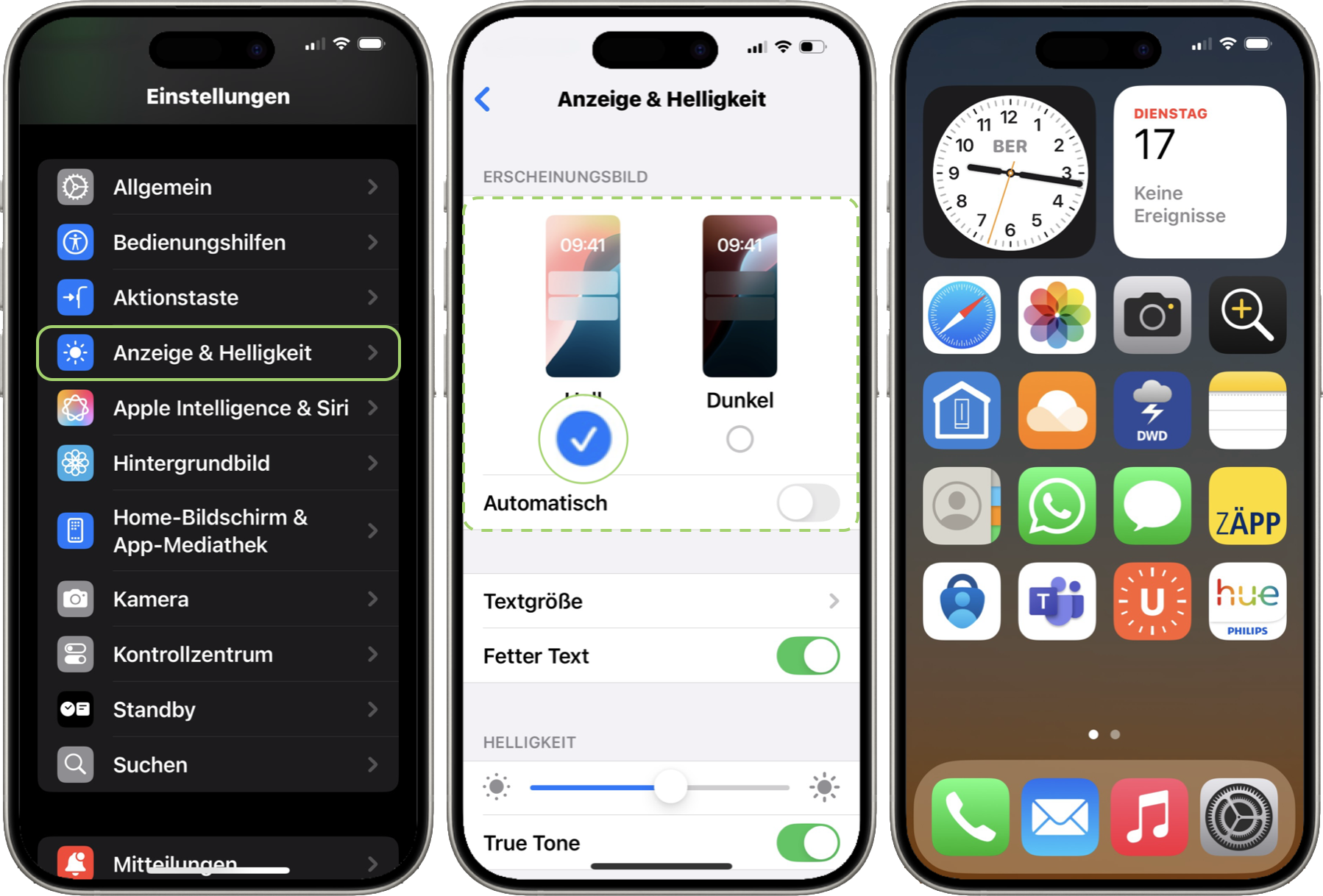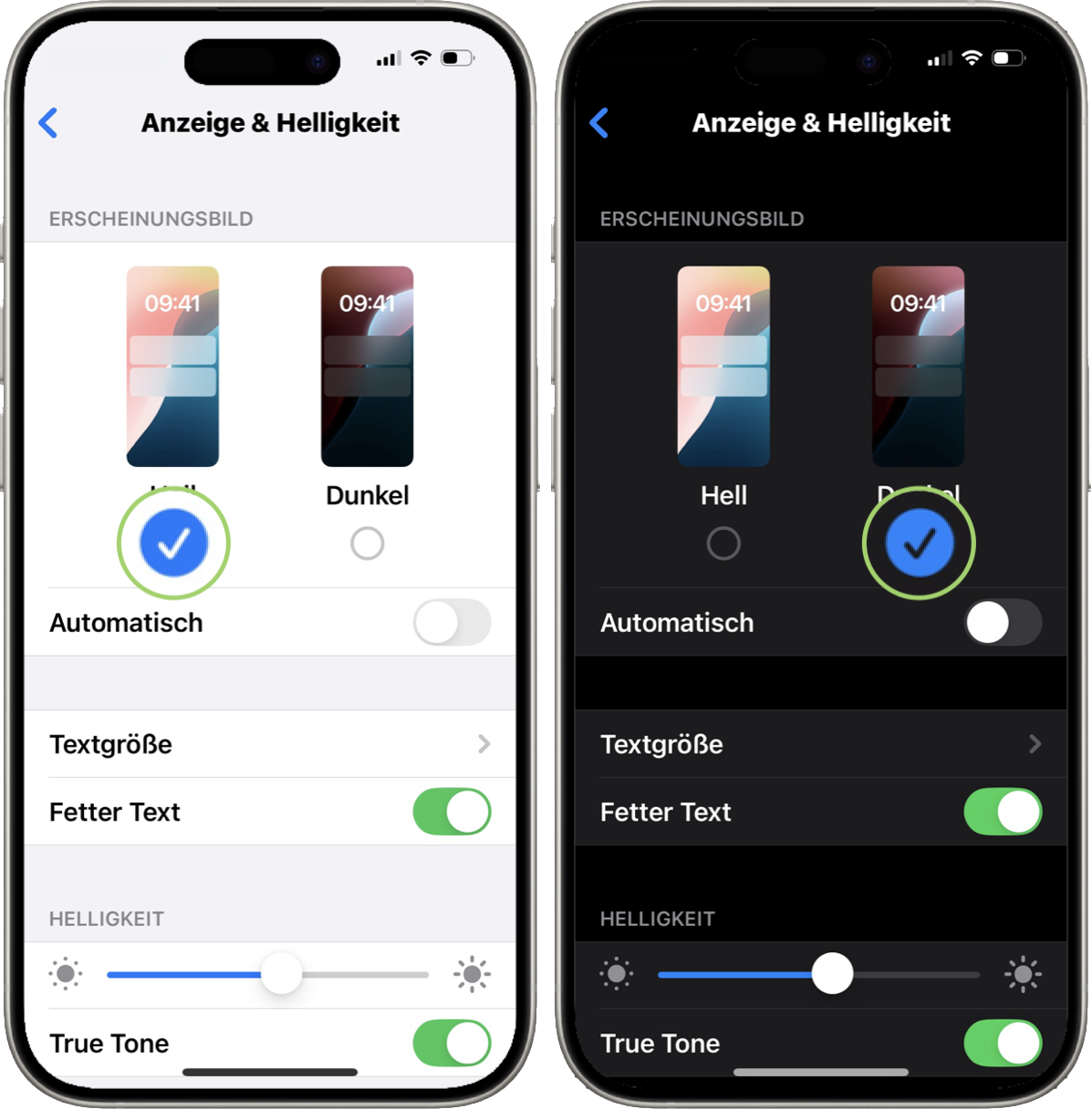 Wähle bitte den Dunkelmodus, um eine dunklere und damit für dich angenehme Darstellung für dein iPhone zu wählen. Die Darstellung der Icons und Bedienelemente bleibt davon unberührt.