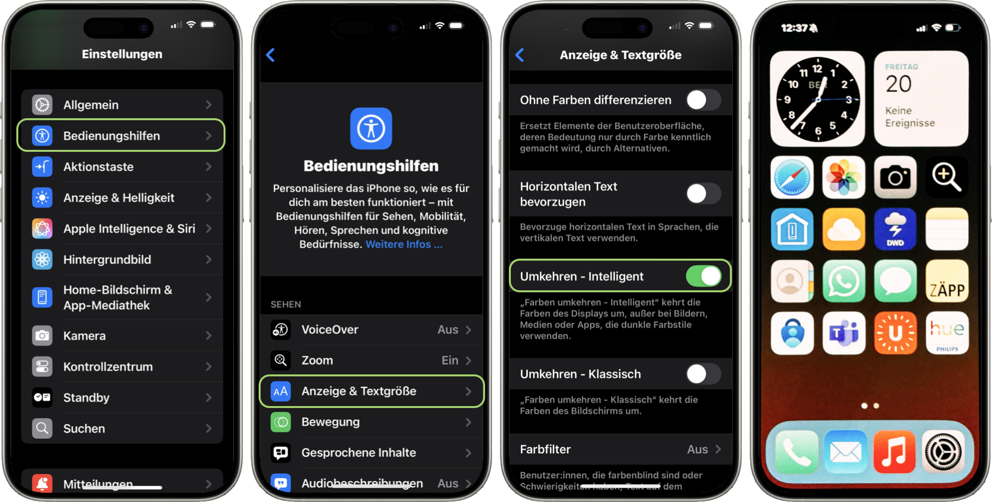 Deaktivierst du Umkehren-Intelligent bei zuvor aktiviertem Dunkelmodus, kehrt die Farbdarstellung in ihre ursprüngliche Darstellung zurück, der Dunkelmodus bleibt jedoch erhalten.