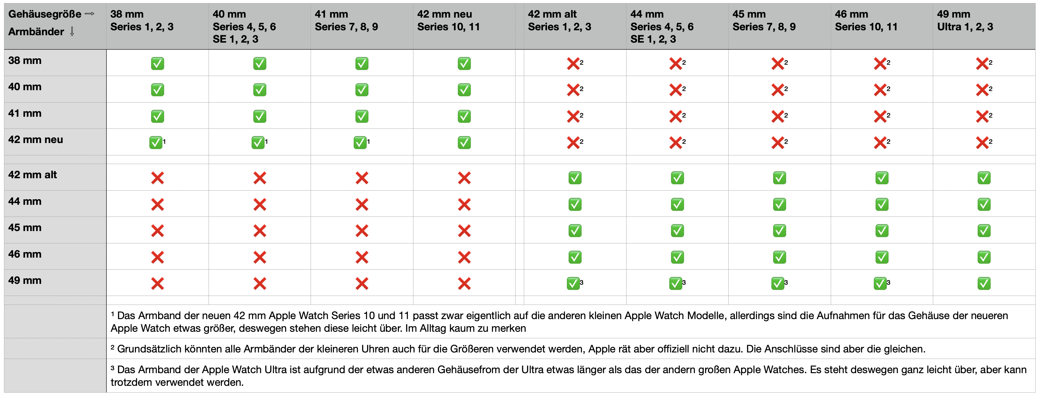 Die Armbänder und deren Kompatibilität wird jetzt um ein vielfaches komplizierter. Da Apple beim Release der Apple Watch Series 10 nun ein 42mm Modell eingeführt hat, welches aber kein direkter Nachfolger des damaligen 42mm Modells ist.