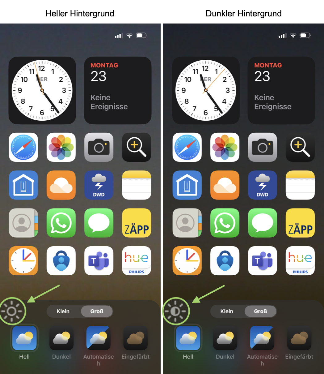 Die helle bzw. dunkle Darstellung spricht nicht nur die persönliche Gestaltung des Home-Bildschirms an. Gerade auch für Menschen mit einer Einschränkung des Sehvermögens stellt sie eine Hilfe dar.