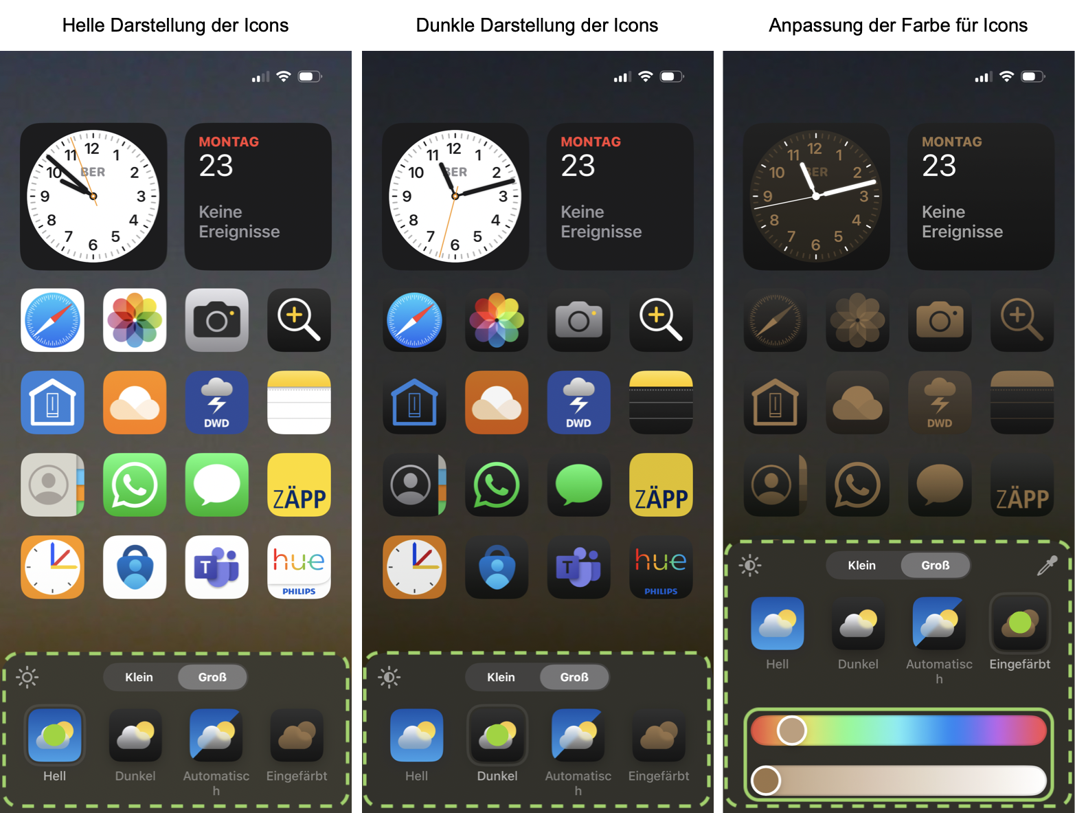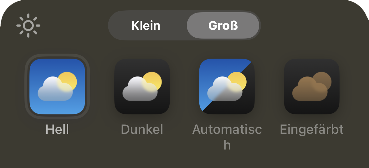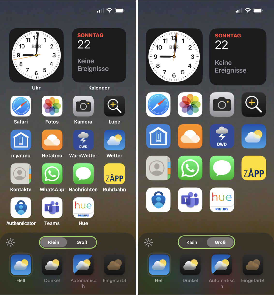 Hierüber lässt sich nicht nur die Größe der Icons, sondern auch das Erscheinungsbild (hell oder dunkel) einstellen. Auch die Farbe der Icons kannst du hier nach deinen Wünschen einstellen. Die Größe deiner Icons wählst du über „Klein“ oder „Groß".