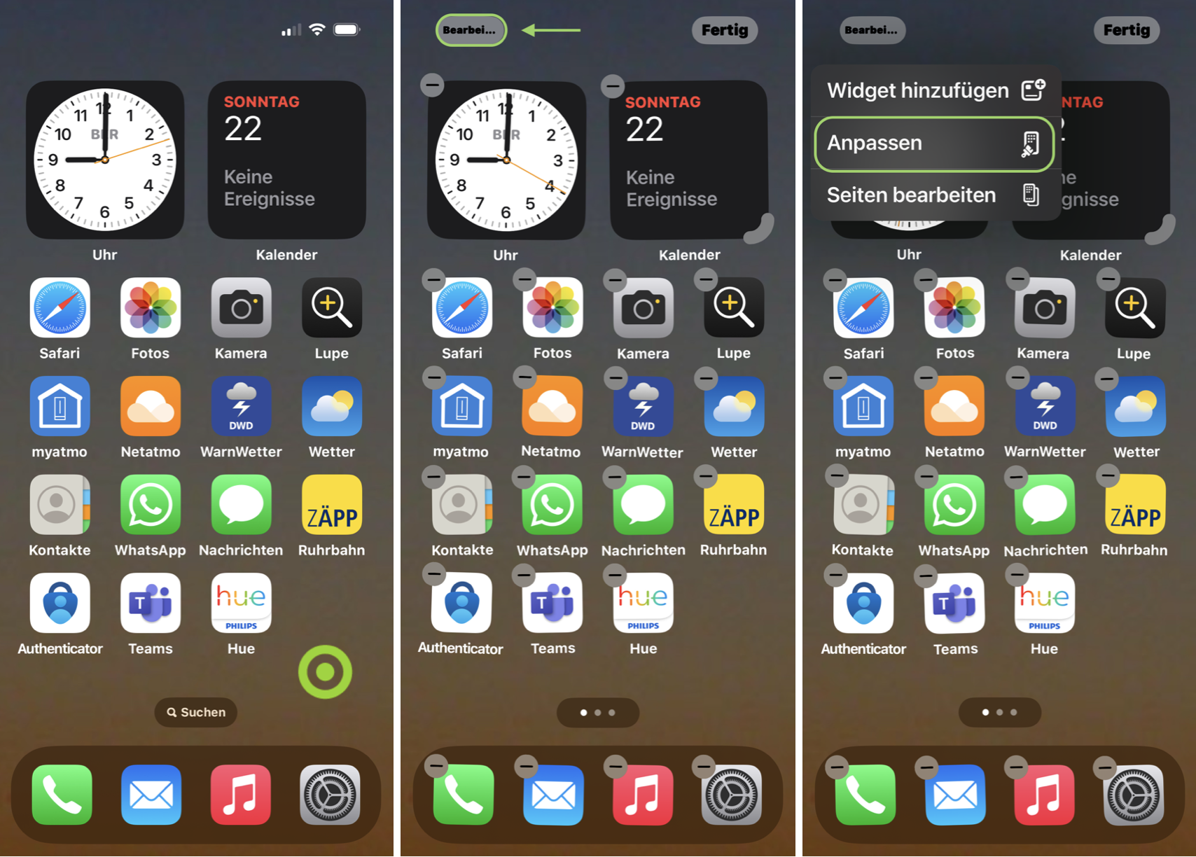 Neu hinzugekommen ist die Möglichkeit, die Größe der Icons und das Erscheinungsbild zu ändern. Tippst du links oben auf „Bearbeiten“, wird dir ein Fenster mit drei Auswahlmöglichkeiten angezeigt. Neben der Möglichkeit, Widgets hinzuzufügen oder einzelne Seiten anzupassen, gibt es noch die Optionen „Anpassen“.