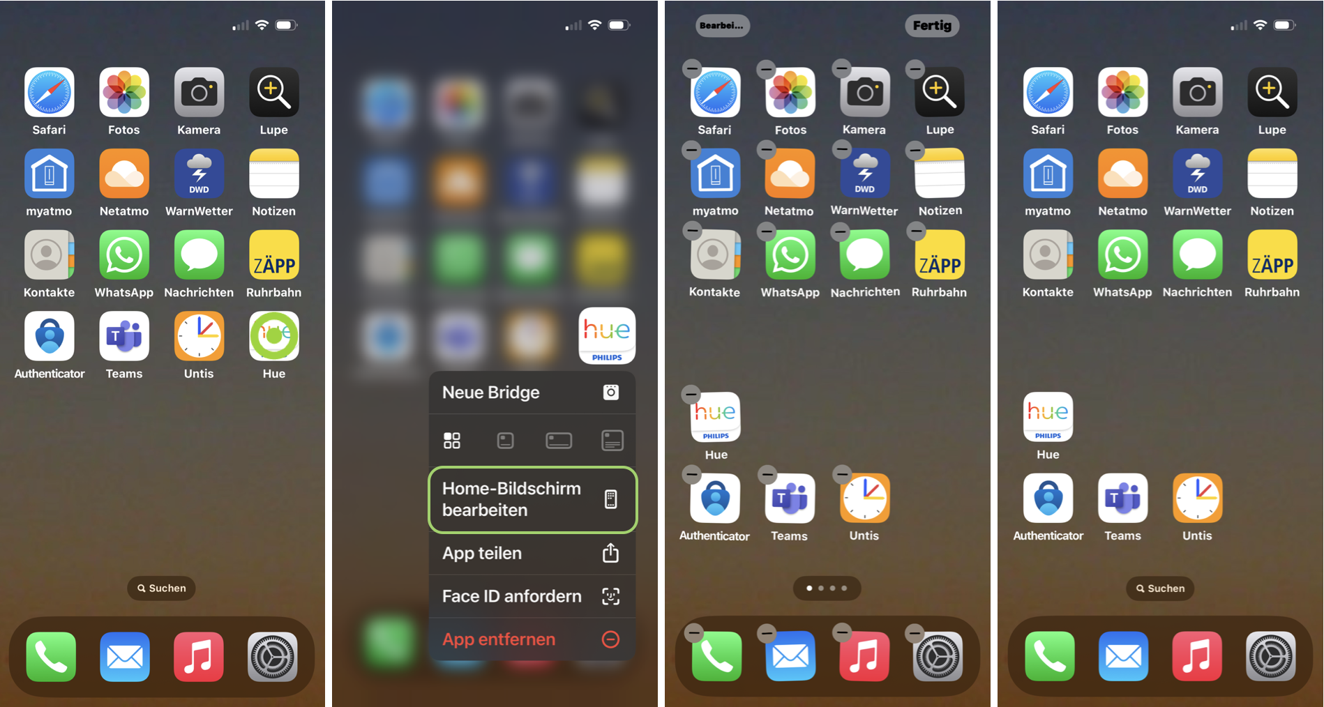 oder den bisher bewährten Weg wählen und deine Icons frei anordnen, wenn es der Platz auf der ausgewählten Seite deines Home-Bildschirms zulässt. Tippe dann auf "Fertig" - fertig.