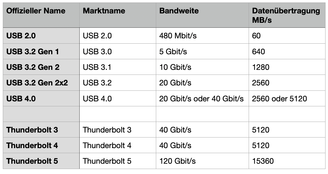 Hier gibt es einmal eine Tabelle für den USB-C Standard, wo beschrieben wird, welche Geschwindigkeiten jeweils erreicht werden können für welchen Standard Kabel.