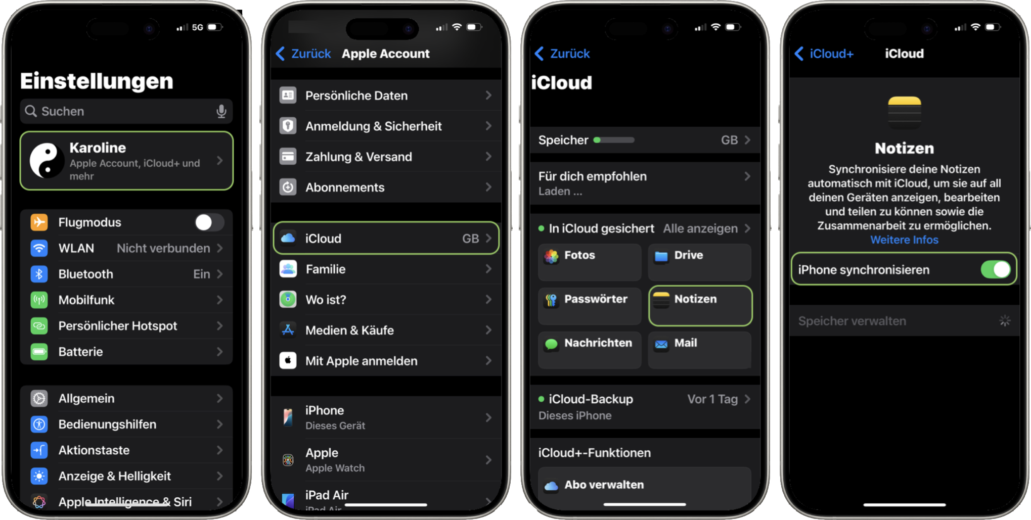 Tippe im Folgebildschirm unter „In iCloud gesichert“ auf „Notizen“ und aktiviere den Button rechts neben „iPhone synchronisieren“. Nach kurzer Zeit solltest du deine Notizen wieder auf dem iPhone sehen können.