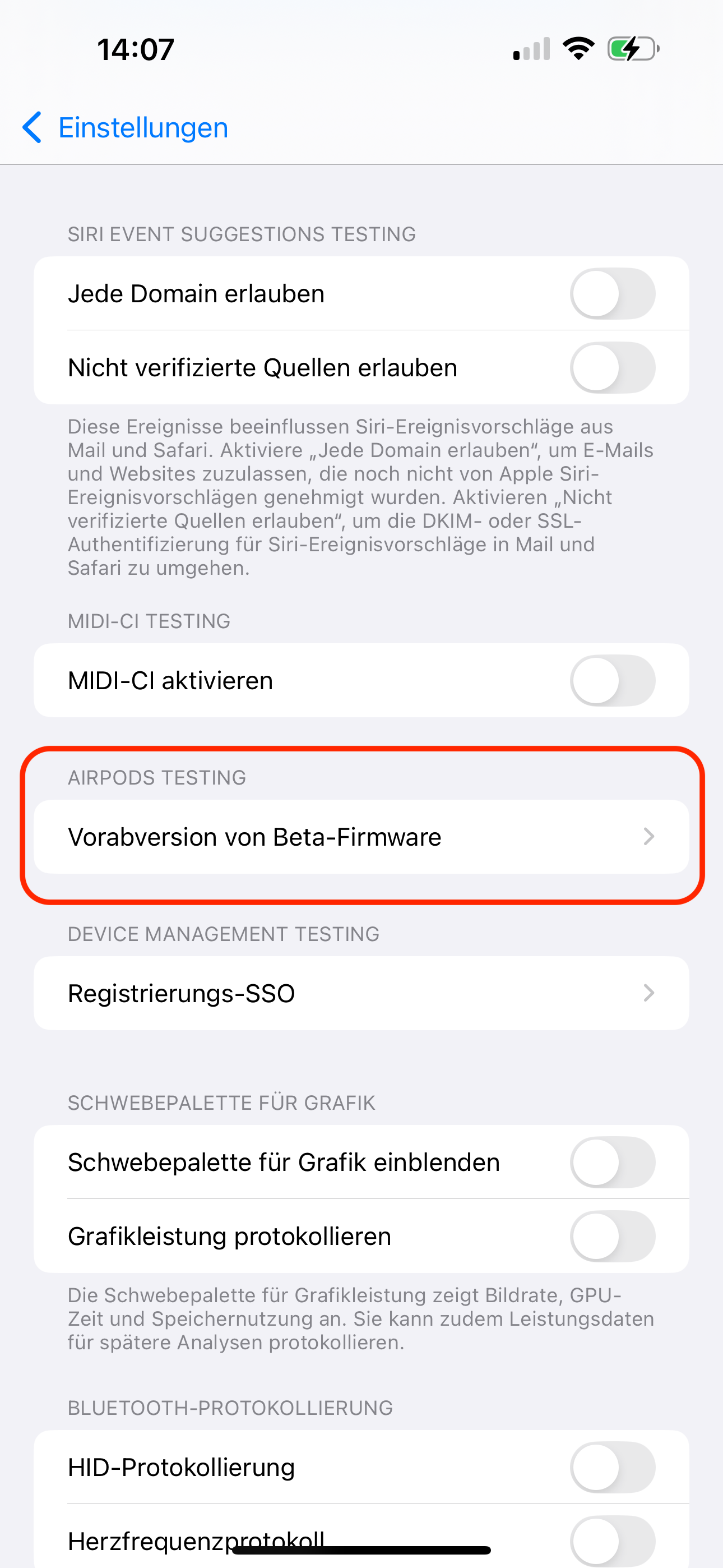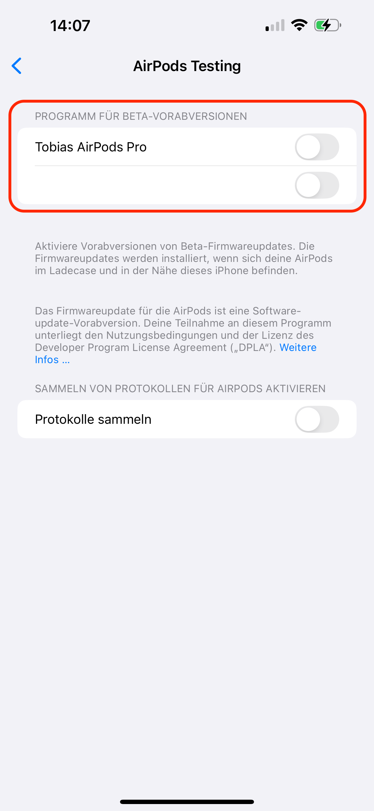 Um dies zu verwenden musst du keine weitere Verbindung mehr zu Xcode haben, hier reicht die Einstellung auf dem Gerät vollkommen aus. Tippe auf die Einstellung und navigiere dann zu dem Punkt: Vorabversion von Beta-Firmware. Gehe dann in diese Einstellung rein und aktiviere die AirPods Beta für das gewünschte Paar: