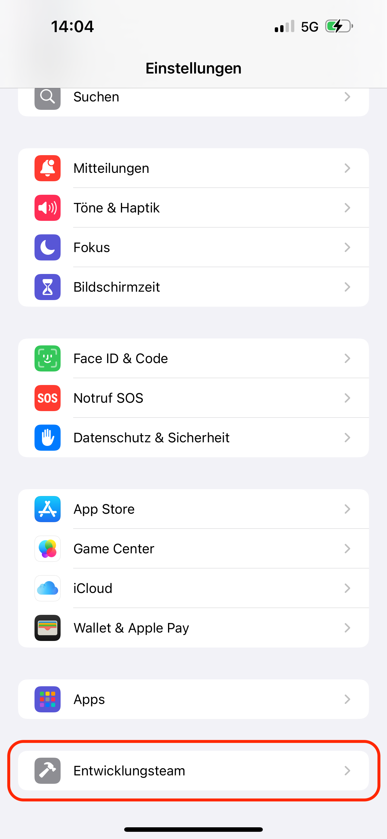 Nun erscheint in den Einstellungen nun der Button Entwicklungsteam, dieses findest du hier ganz unten: