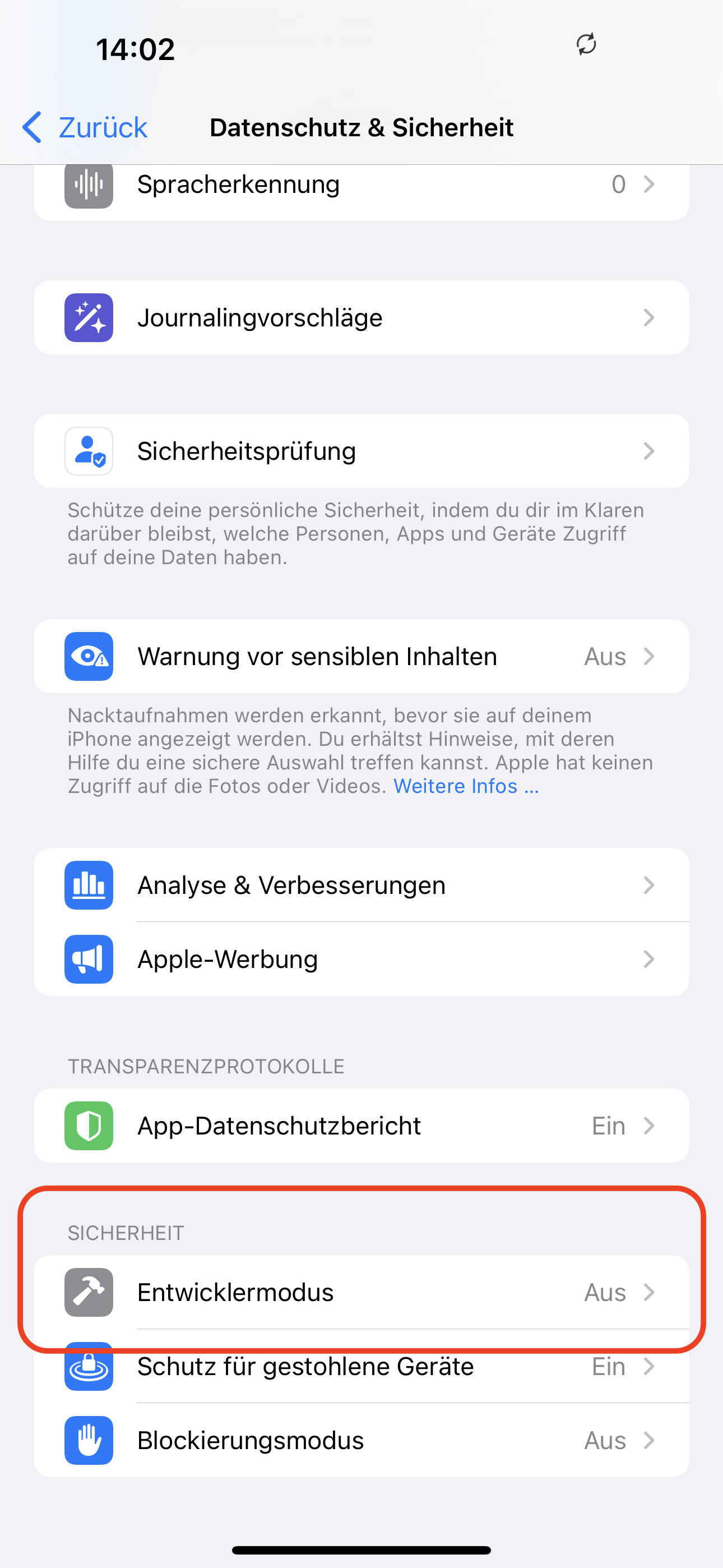 Verbinde dann im zweiten Schritt dein iPhone mit dem Mac, auf dem gerade Xcode aktiv ist, via Kabel, verifiziere das du möchtest das der Mac auf das iPhone zugreifen kann und gehe danach auf dem iPhone zu Einstellungen - Datenschutz & Sicherheit. Hier gibt es nun einen neuen Temporären Button Entwicklermodus:
