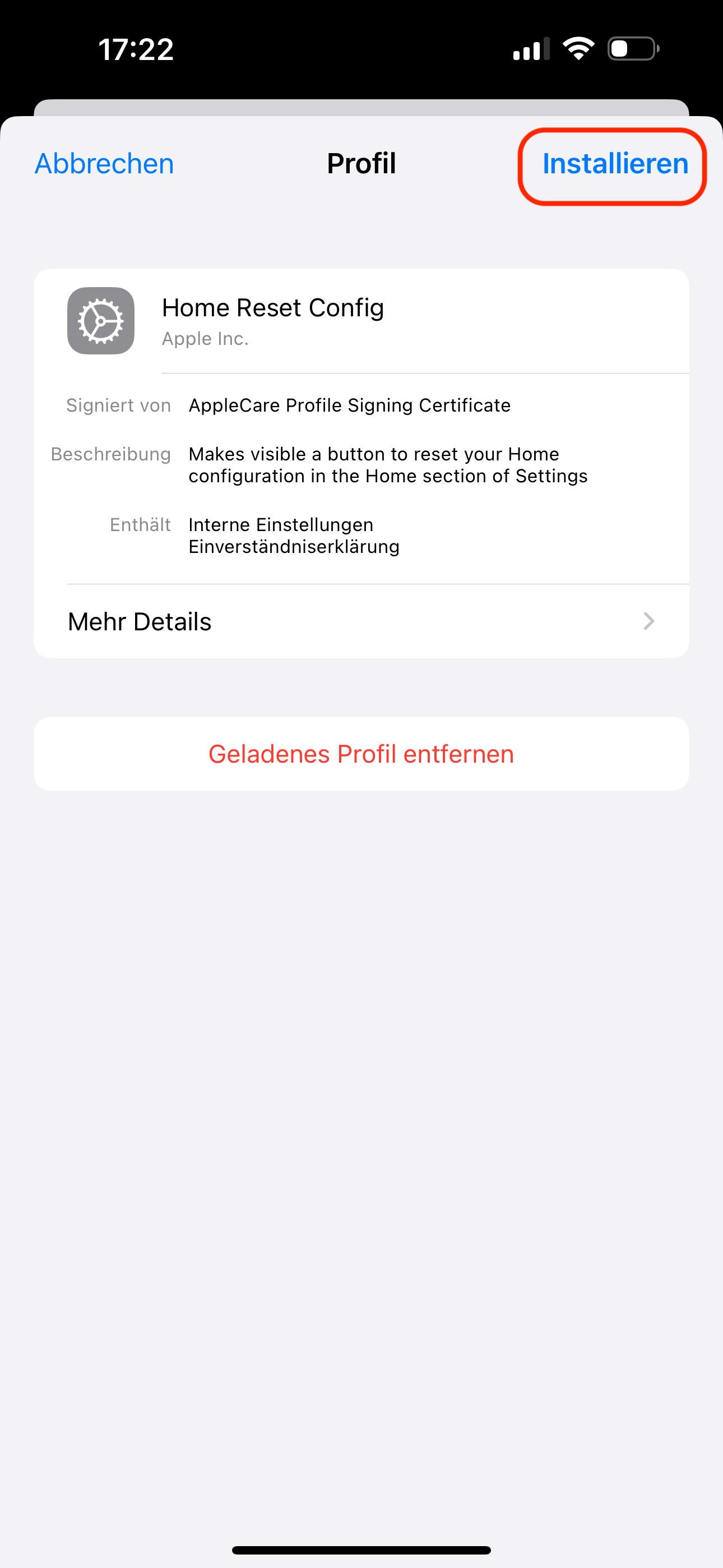 Hier vorab eine Warnung. Die Durchführung des Zurücksetzten des kompletten Apple Homes sollte immer der aller letzte Weg sein. Dieses Profil gibt es, solltest du ernsthafte Probleme haben, vom Support.
