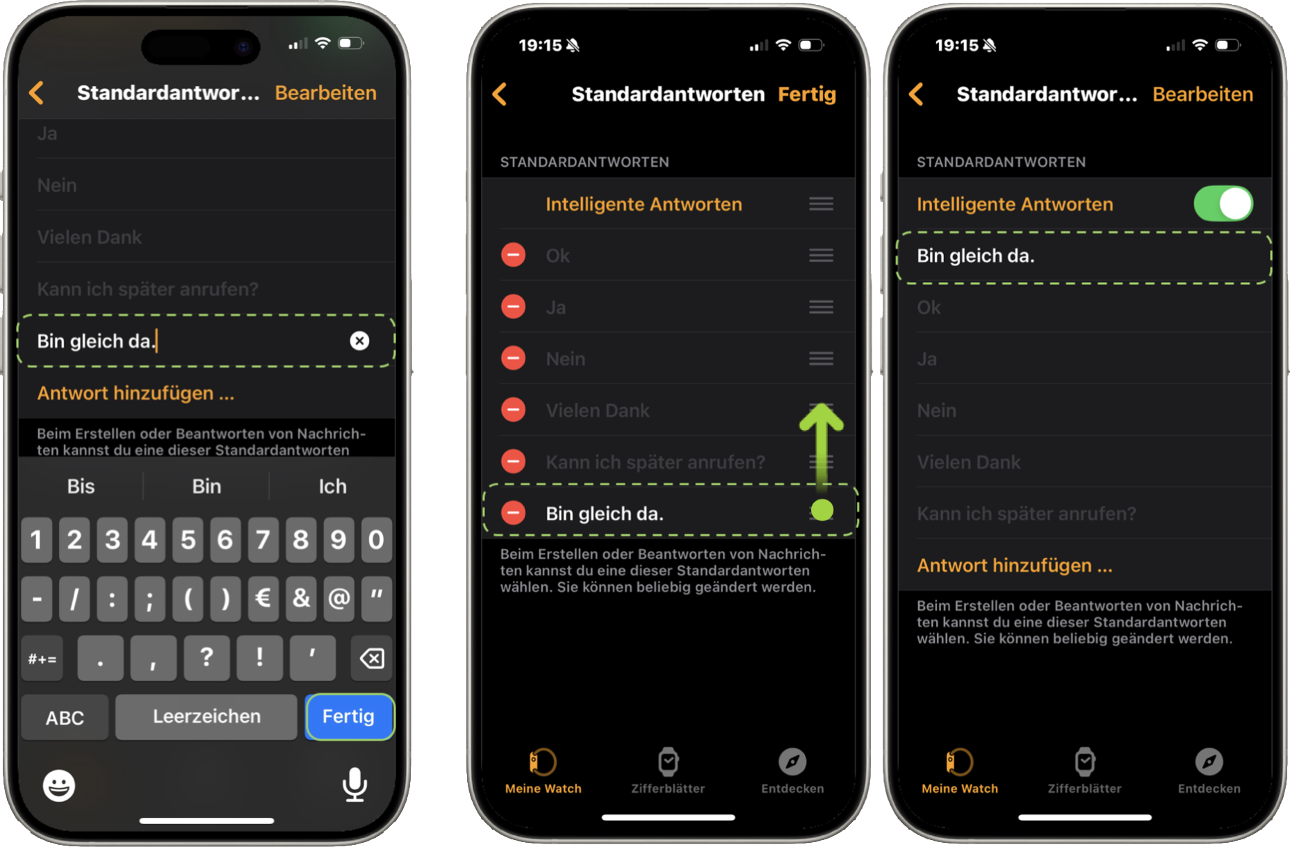 Wie du siehst, wird deine Antwort ganz unten in der Liste angehängt. Tippst du auf „Bearbeiten“, lässt sich diese neu anordnen. Die Anordnung ist deshalb wichtig, weil sich diese auch auf deiner Apple Watch auswirkt.