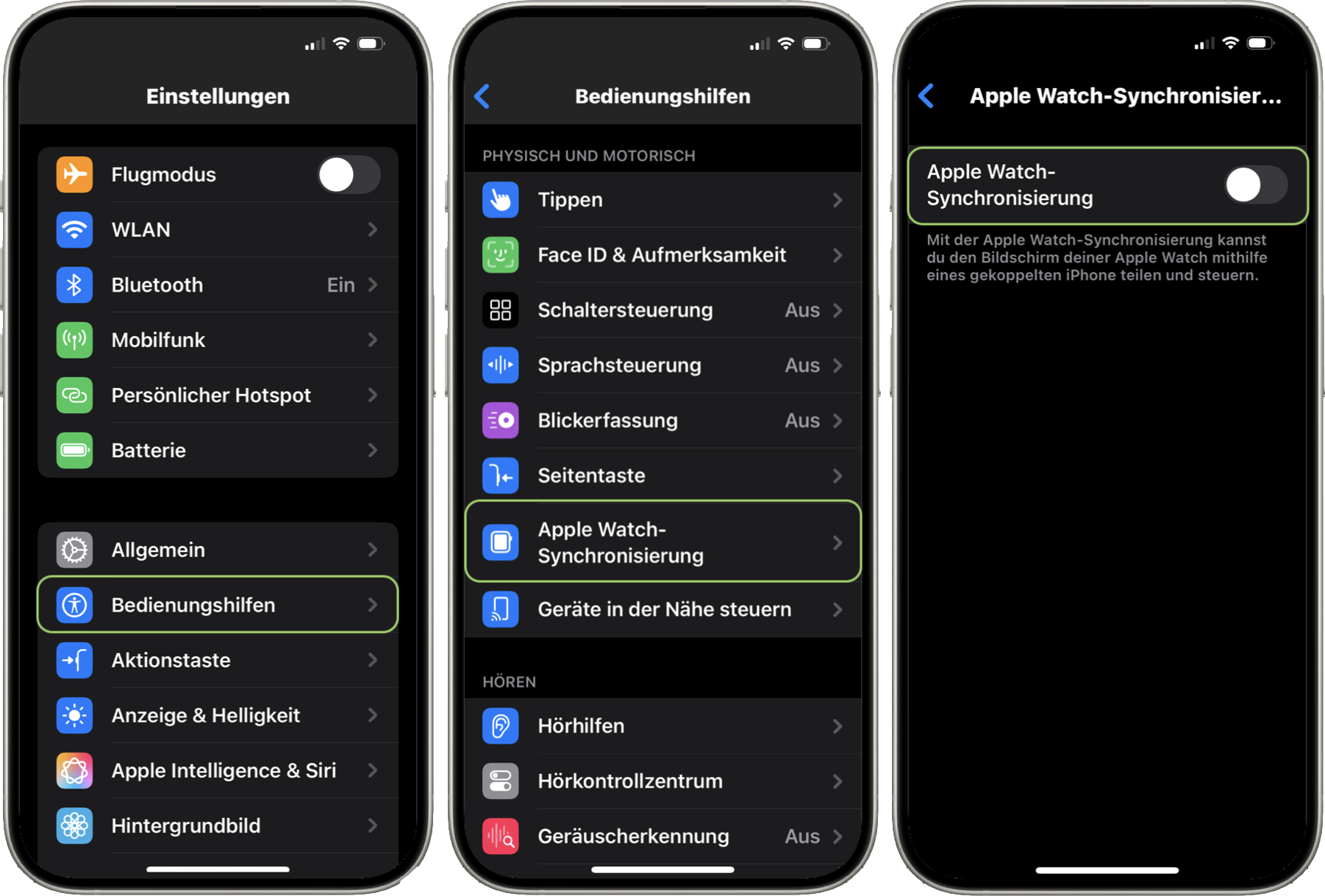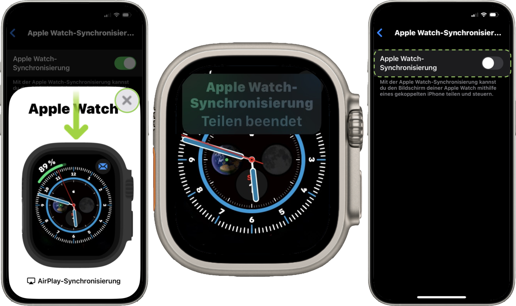 Auf deiner Apple Watch erscheint die Nachricht, dass das Teilen beendet wird. Der blaue Rahmen wird nicht mehr angezeigt und auf deinem iPhone ist der Button rechts neben „Apple Watch-Synchronisierung“ deaktiviert.