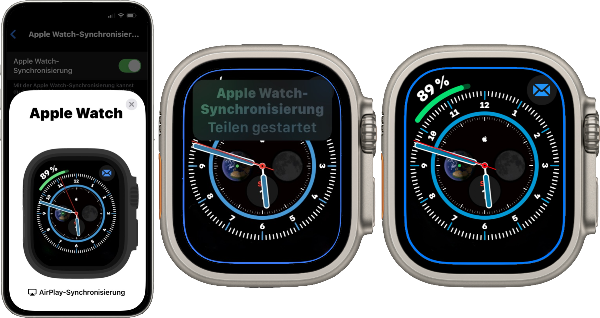 Steht die Verbindung, wird dir dein Zifferblatt auf dem iPhone angezeigt und die Apple Watch zeigt an, dass das Teilen für die Synchronisation gestartet wurde.