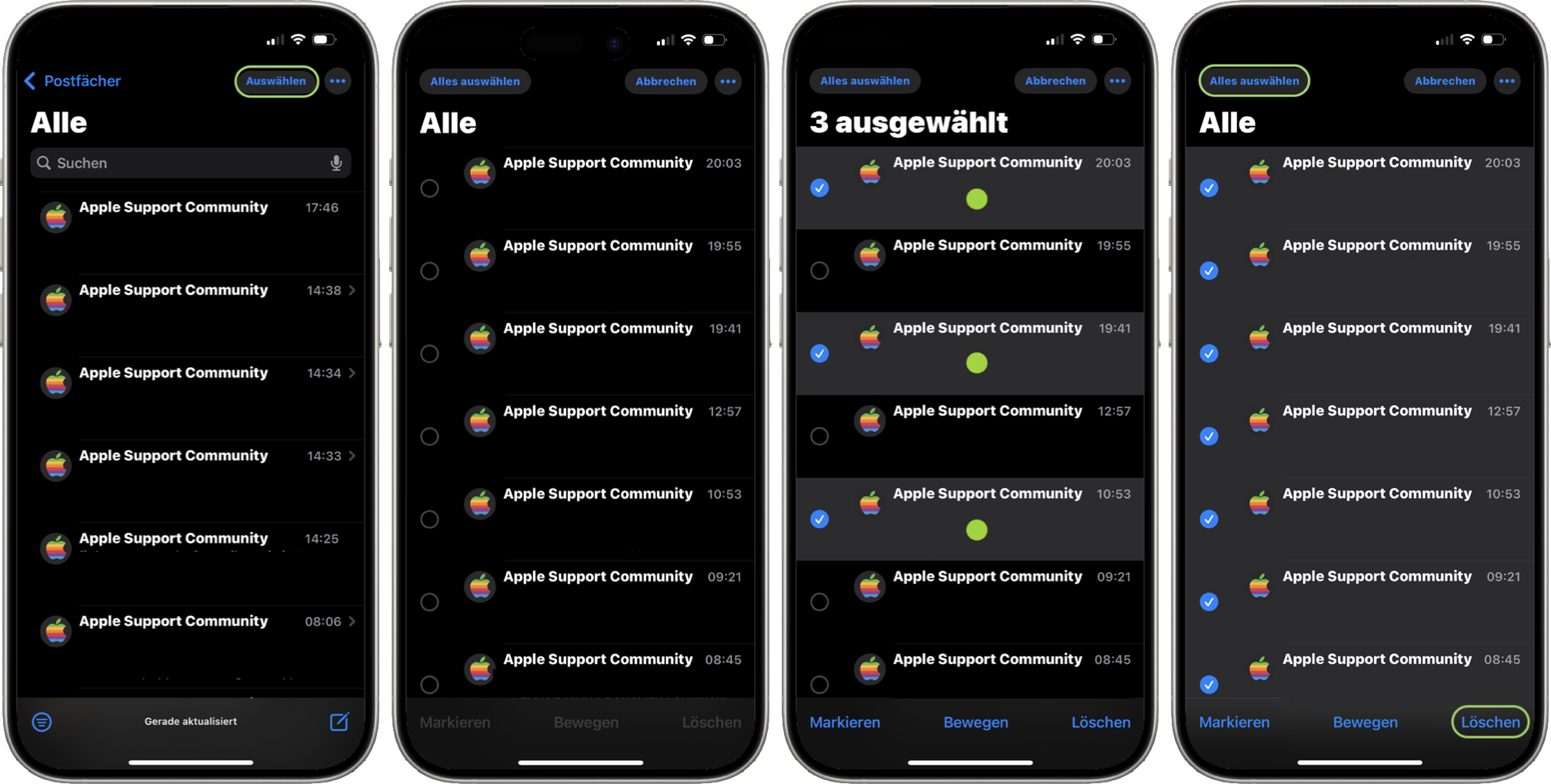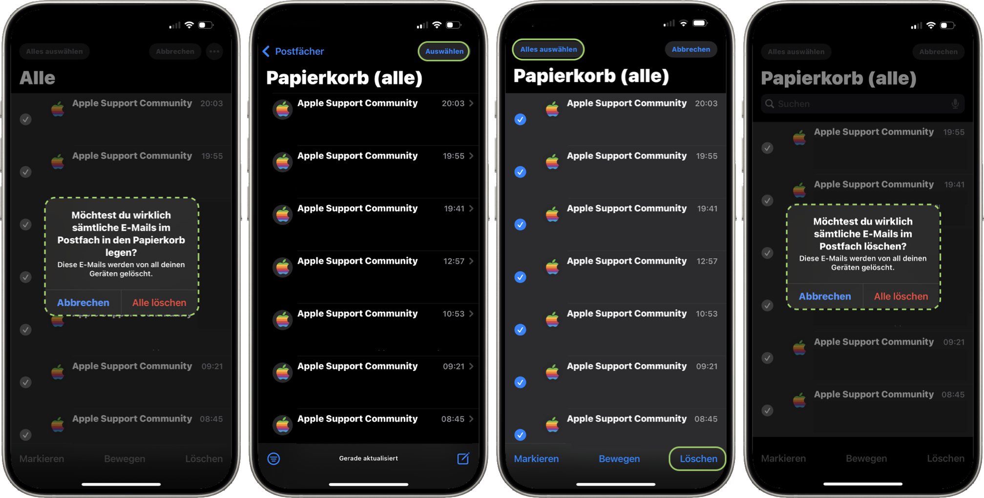 oder nutzt „Alles auswählen“ um den Haken vor allen Mails zu aktivieren. Wählt ihr auf dem Display rechts unten „Löschen“, werden die ausgewählten Mails in den Papierkorb verschoben.