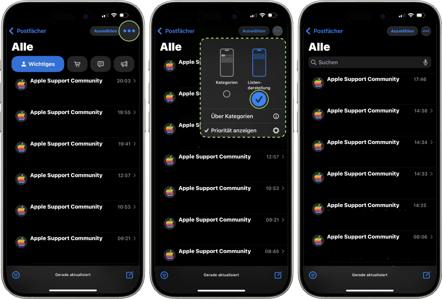 In den Kategorien könnt ihr nicht nur Änderungen vornehmen, ihr könnt diese auch deaktivieren. Öffnet die Mail-App und tippt rechts oben auf dieses Symbol.