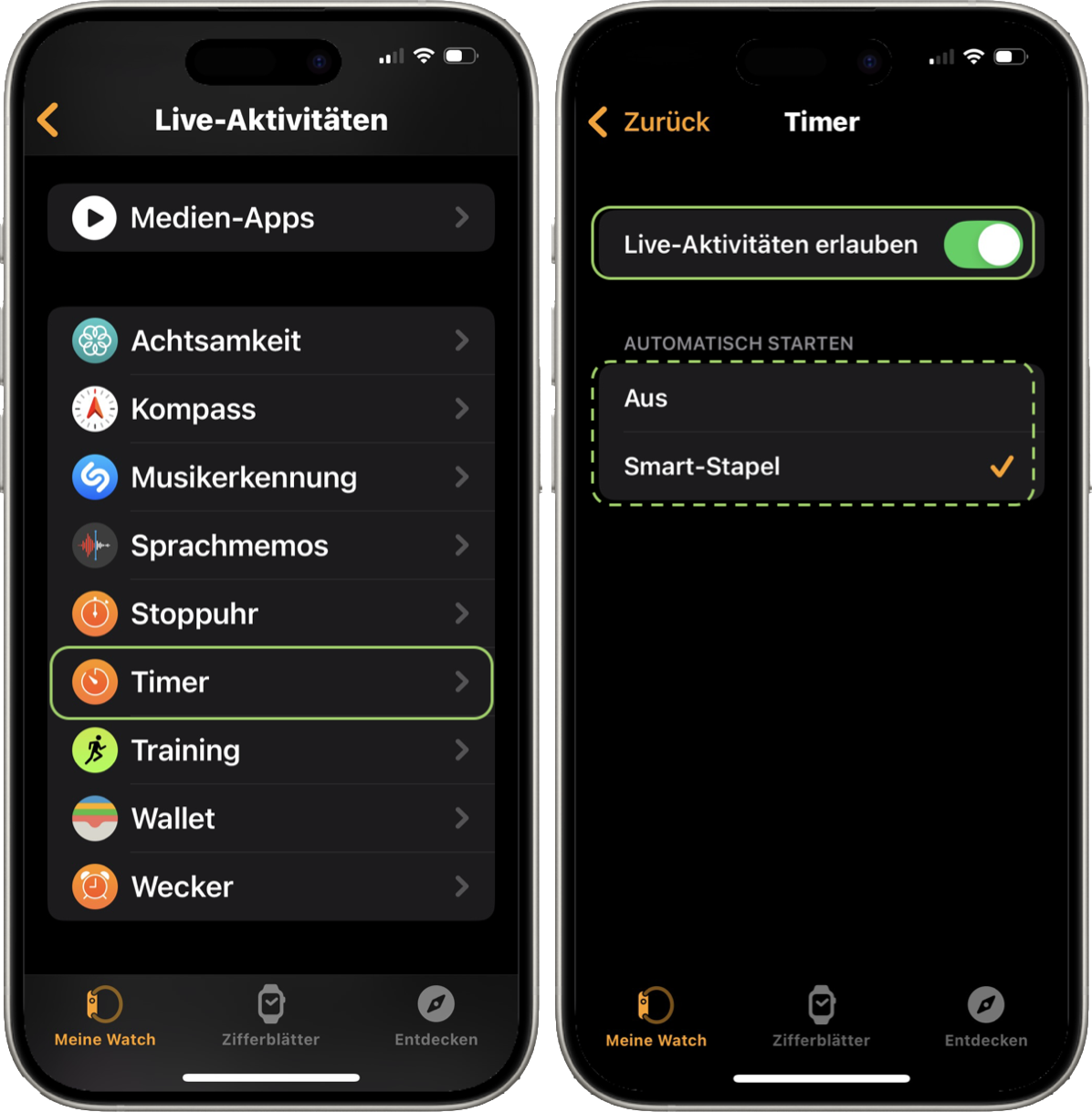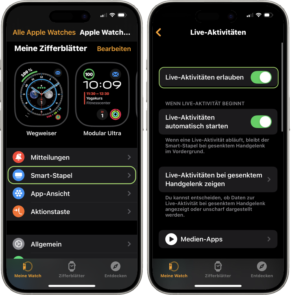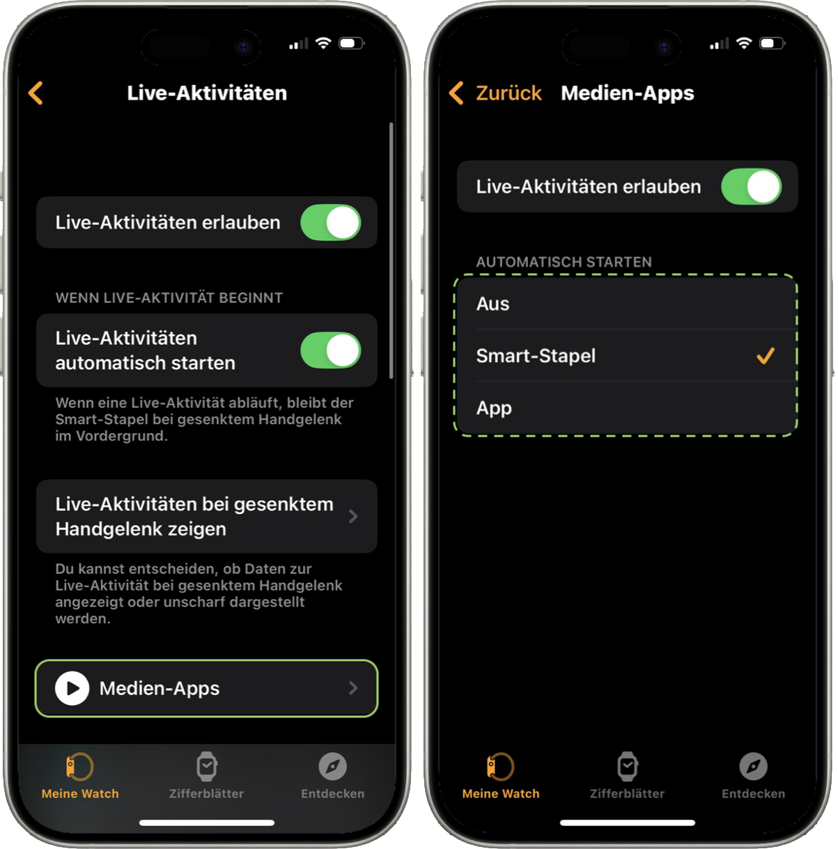 Neben den Medien-Apps lässt sich auch die Live-Aktivität einzelner Apps deaktivieren, die sich auf deiner Apple Watch befinden.
