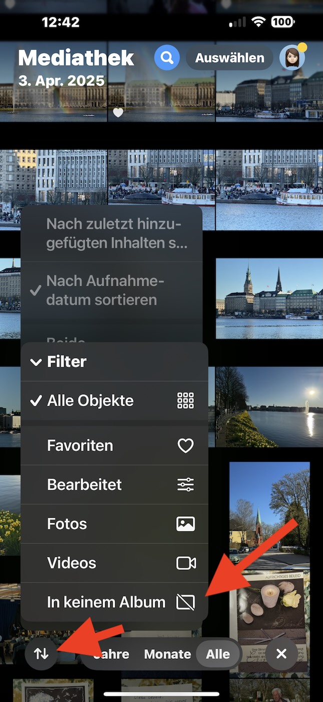 Auf einem iPhone, das iOS 18.4 unterstütz gibt es jetzt auch eine elegante Möglichkeit, die nicht iCloud Fotos erfordert. Die Filter sind erweitert worden, eine der besten Neurungen unter iOS 18. Wir können mit einem Filter alle Fotos gleichzeitig auswählen, die nicht in einem Album sind. Für ein sichere Löschen, bei dem wir nicht versehentlich wichtige Fotos löschen, brauchen wir zwei Schritte: