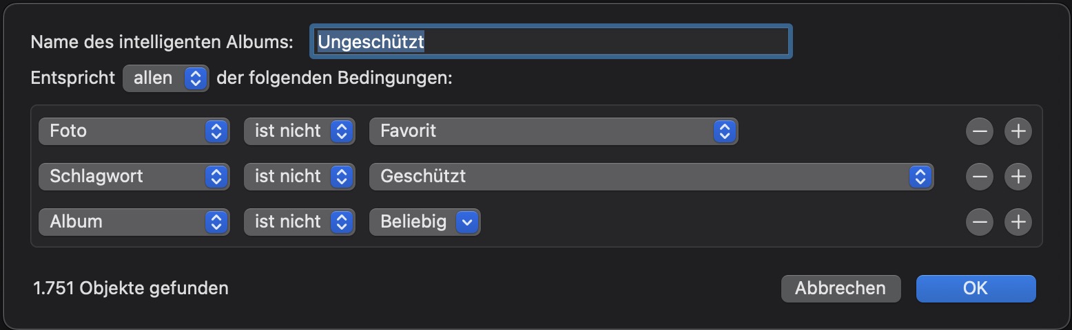 Wir können Fotos ein Schlagwort "Geschützt" zuweisen und uns darauf in einem intelligenten Album beziehen. Beispielsweise zeigt uns dann da das folgende Intelligente Album nur noch Fotos an, die wir löschen könnten, weil sie