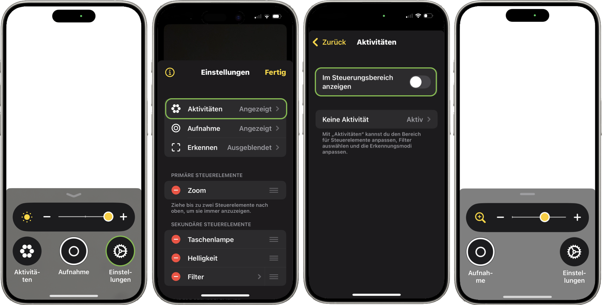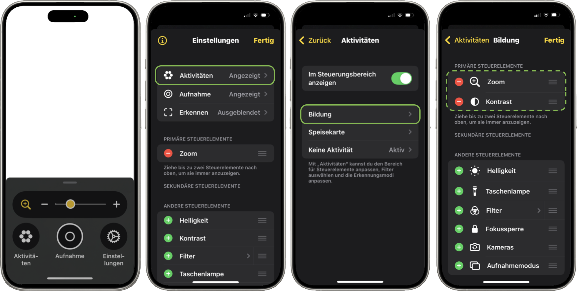 Die Aktivitäten gehören zum Bereich der Steuerelemente und natürlich lassen sich diese auch ebenso anpassen. Deine Aktivitäten kannst du direkt aus „Aktivitäten" in der App „Lupe", dem Bereich „Lupe" in der App „Kurzbefehle" oder mit einem Siri-Aufruf starten, hier beschränke ich mich erst einmal auf die Lupe-App.