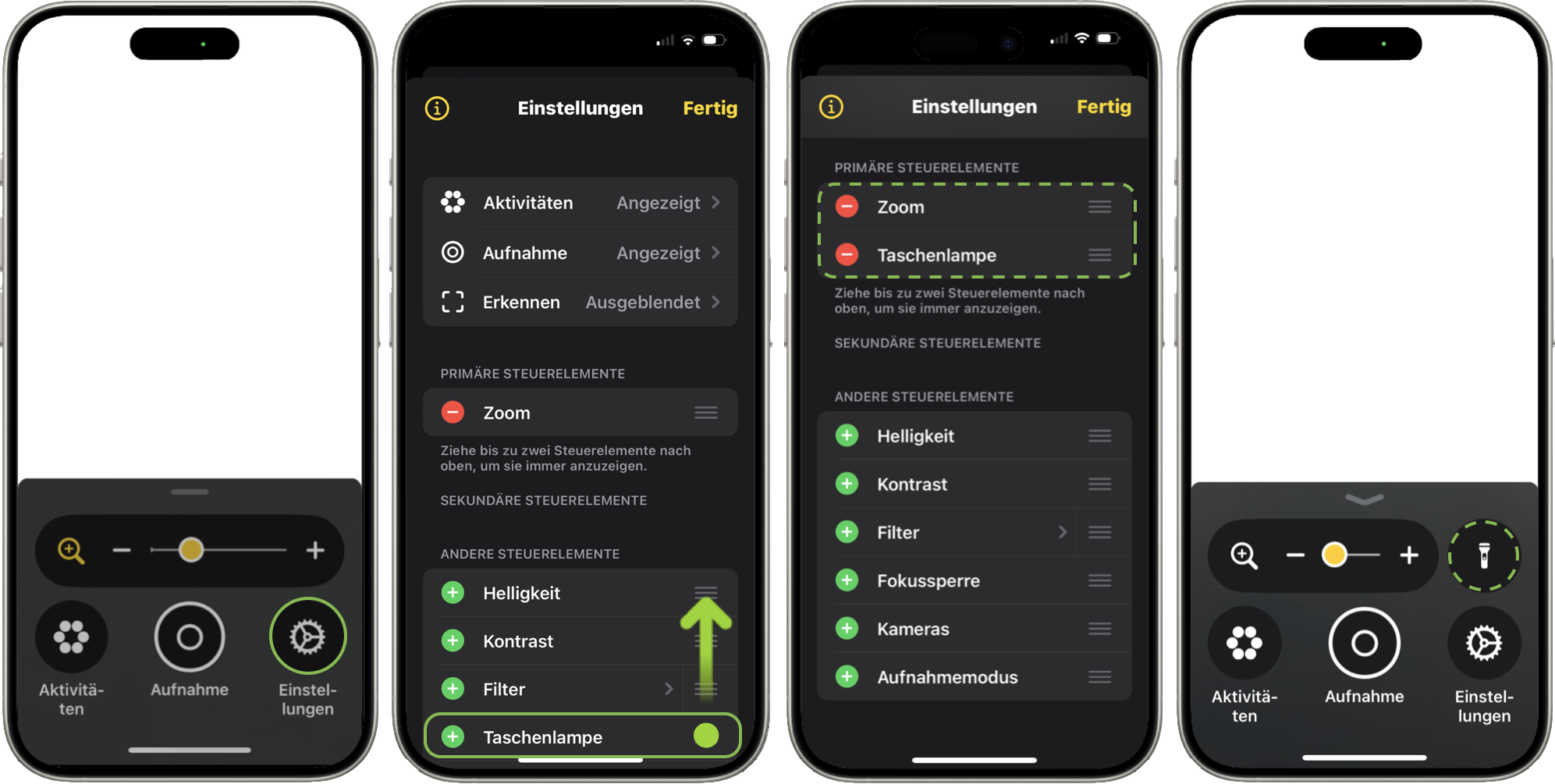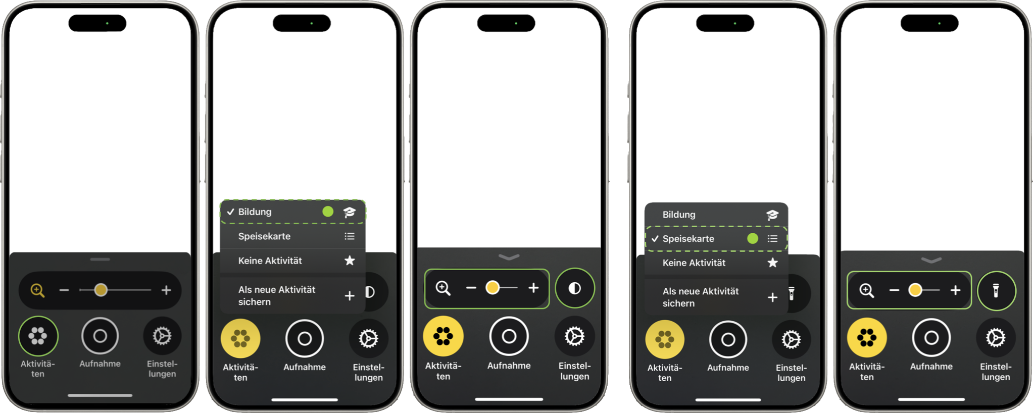 Die Steuerelemente „Taschenlampe“, „Helligkeit“ und „Kontrast“ habe ich den sekundären Steuerelementen zugeordnet. Aufrufen lassen sich diese, indem du in der App auf den Pfeil tippst und mit dem Finger nach oben wischst. In dieser Einstellung kannst du die Steuerelemente einzeln, aber auch in verschiedenen Kombinationen nutzen.
