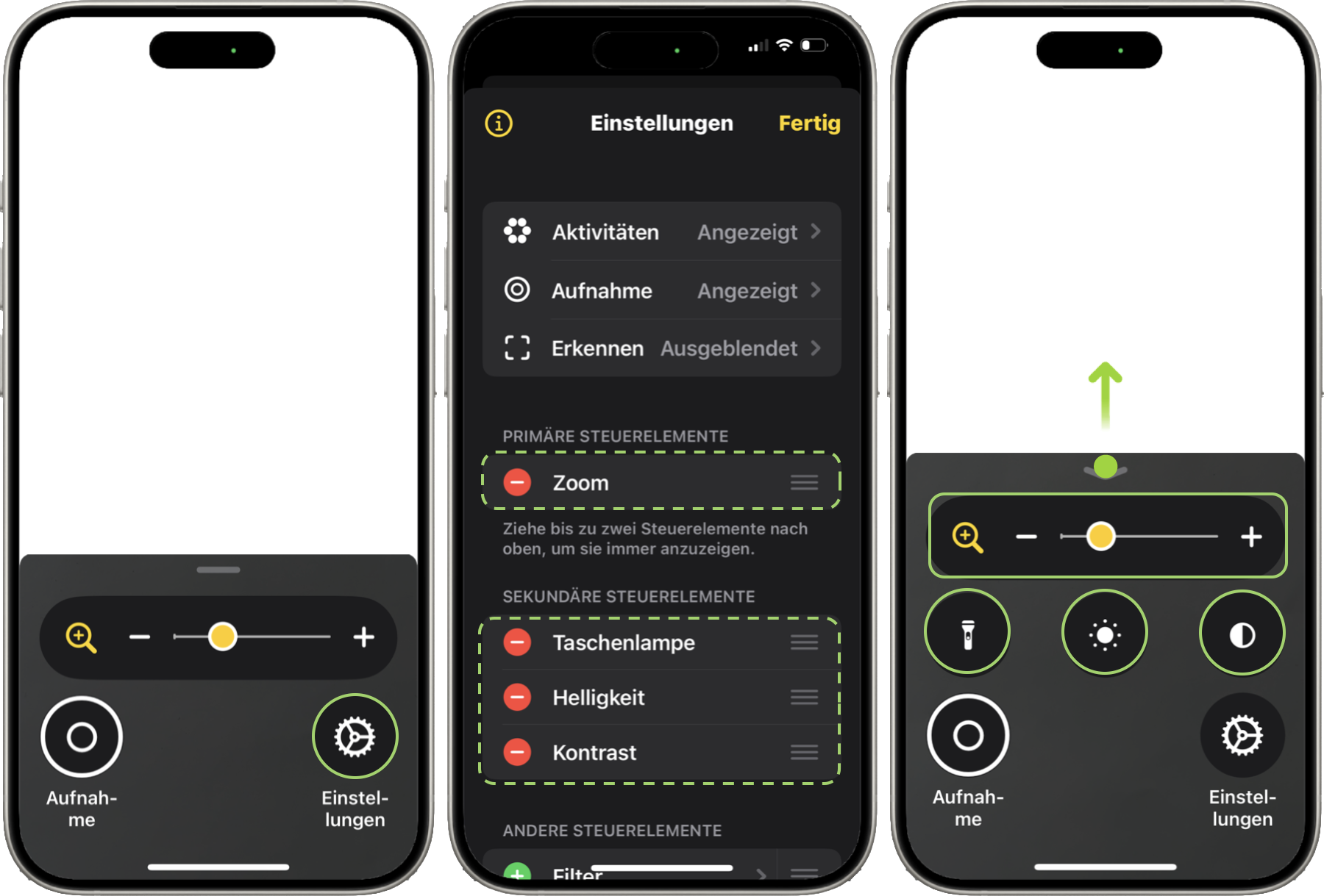 Die Lupe-App startet nach der ersten Inbetriebnahme mit dem Zoom. Tippst du auf Einstellungen, werden dir im Folgebildschirm weitere Steuerelemente angezeigt, die du hinzufügen, einordnen oder entfernen kannst.