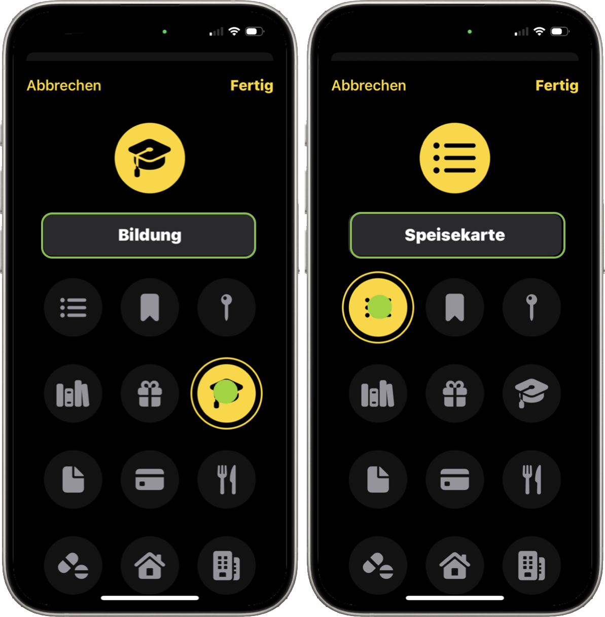 Wähle ein Symbol aus, füge einen Namen hinzu und tippe danach auf „Fertig“.