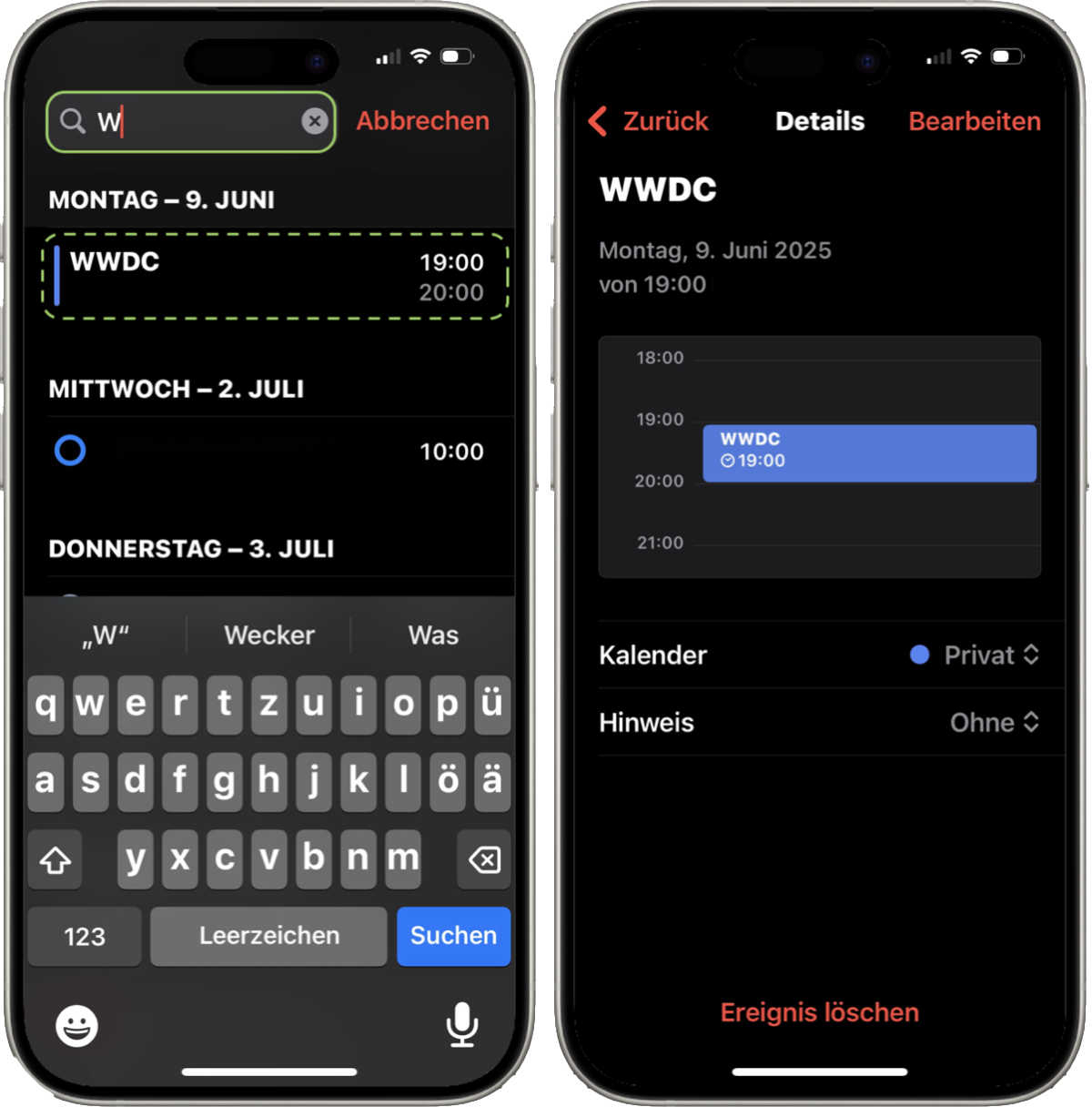 Hast du den Termin oder die Erinnerung gefunden, kannst du dir genauere Informationen anzeigen lassen oder Änderungen vornehmen.