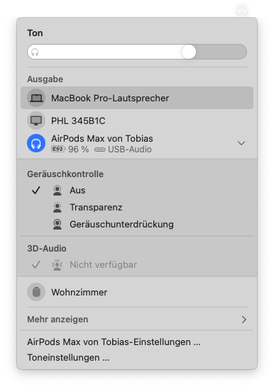 Nun zur wichtigsten Frage, woran kann ich denn erkennen dass die AirPods korrekt per Kabel verbunden sind und die AirPods Max somit Lossless Audio nutzen könnten? Das geht ganz leicht, beim Mac wird beispielsweise unter dem Lautsprecher Symbol in der Menüleiste diese Auswahl hier angezeigte: