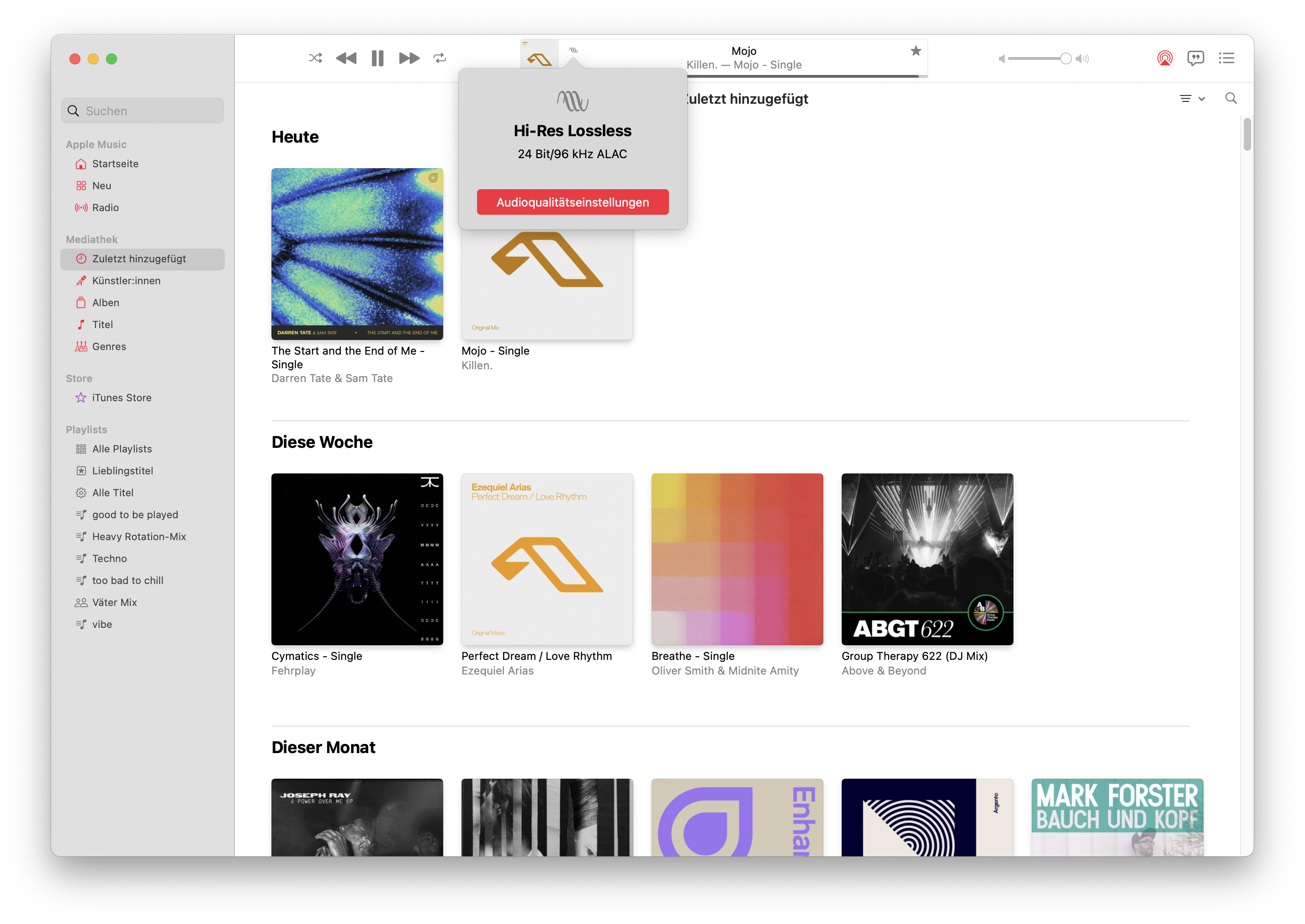 Nun gut, jetzt brauchen wir noch die Titel im Lossless Format (ALAC), hier ist es ratsam die Titel auf das Gerät herunter zu laden. Spielst du nun den Titel ab erkennst du an den Kennzeichnungen im Player, ob dieser gerade in Lossless ist: