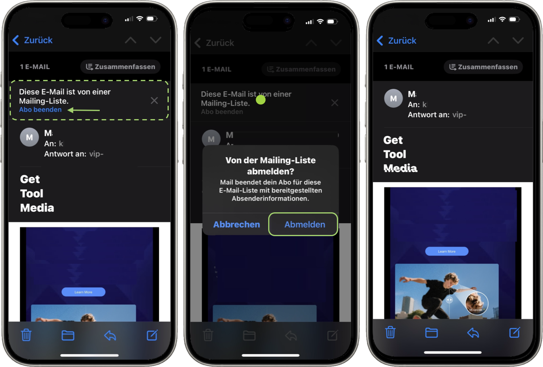Die Mail-App zeigt das Abo nicht nur an, du hast auch die Möglichkeit, dieses sofort zu beenden.