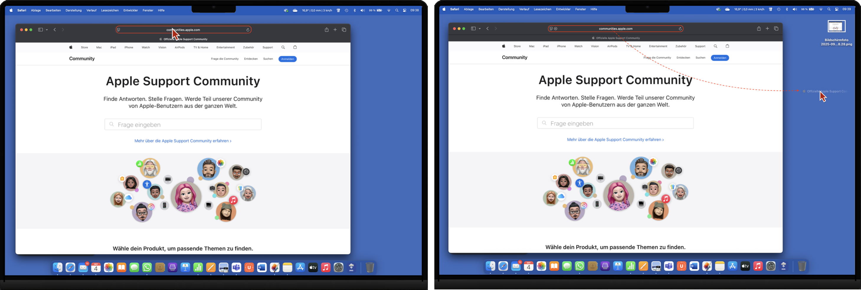 Öffne deinen Web-Browser (hier Safari) und suche die gewünschten Website auf. Klicke auf das Adressfeld, halte die linke Maustaste oder das Trackpad gedrückt, ziehe die Adresse auf den Schreibtisch und lasse dann die Taste / das Trackpad los. Die Website-Verknüpfung wird auf dem Schreibtisch erstellt und dort angezeigt.