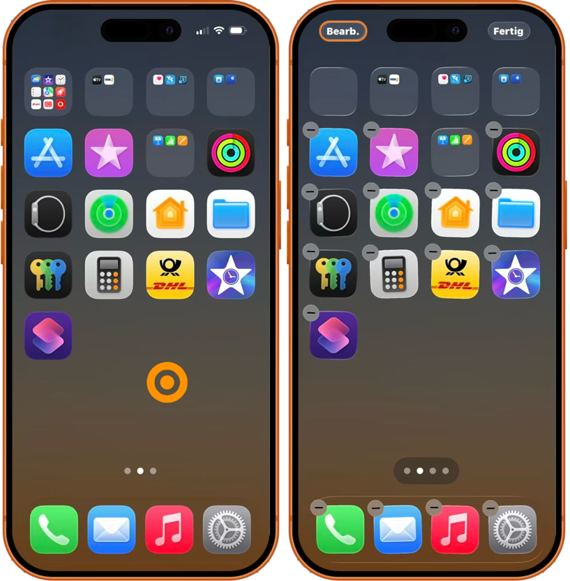 Mit iOS 26.2 werden weitere Einstellmöglichkeiten angeboten, mit denen sich Liquid Glass noch genauer an deine Vorstellungen anpassen lässt. Tippe hierzu länger auf eine freie Stelle deines Displays und danach auf “Bearbeiten“.